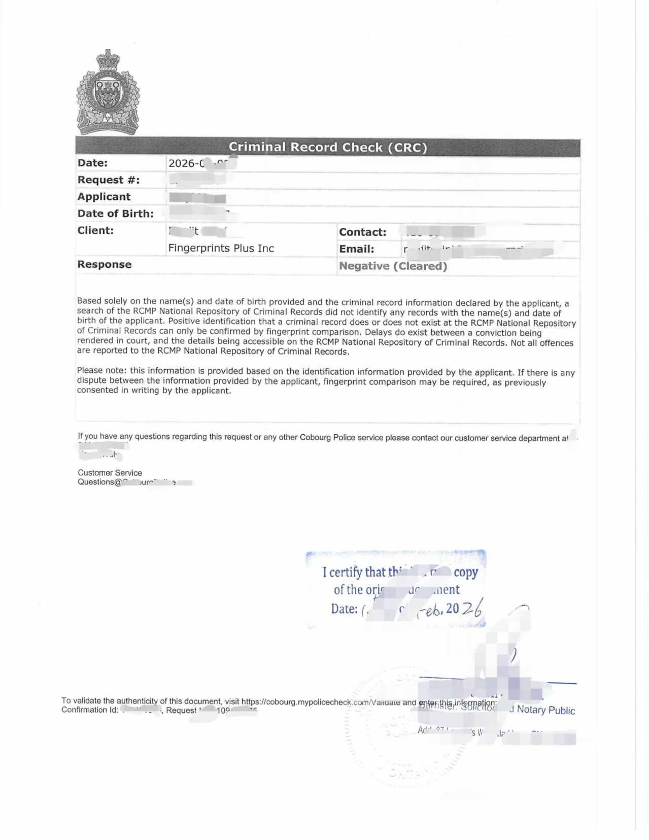 我们协助客户准备身份资料及授权文件,通过合作渠道递交申请。文件由警方系统出具《Criminal Record Check (CRC)》,显示结果为“Negative (Cleared)”——无犯罪记录。文件上载明申请人姓名、出生日期、申请编号及签发日期,具备完整官方信息。