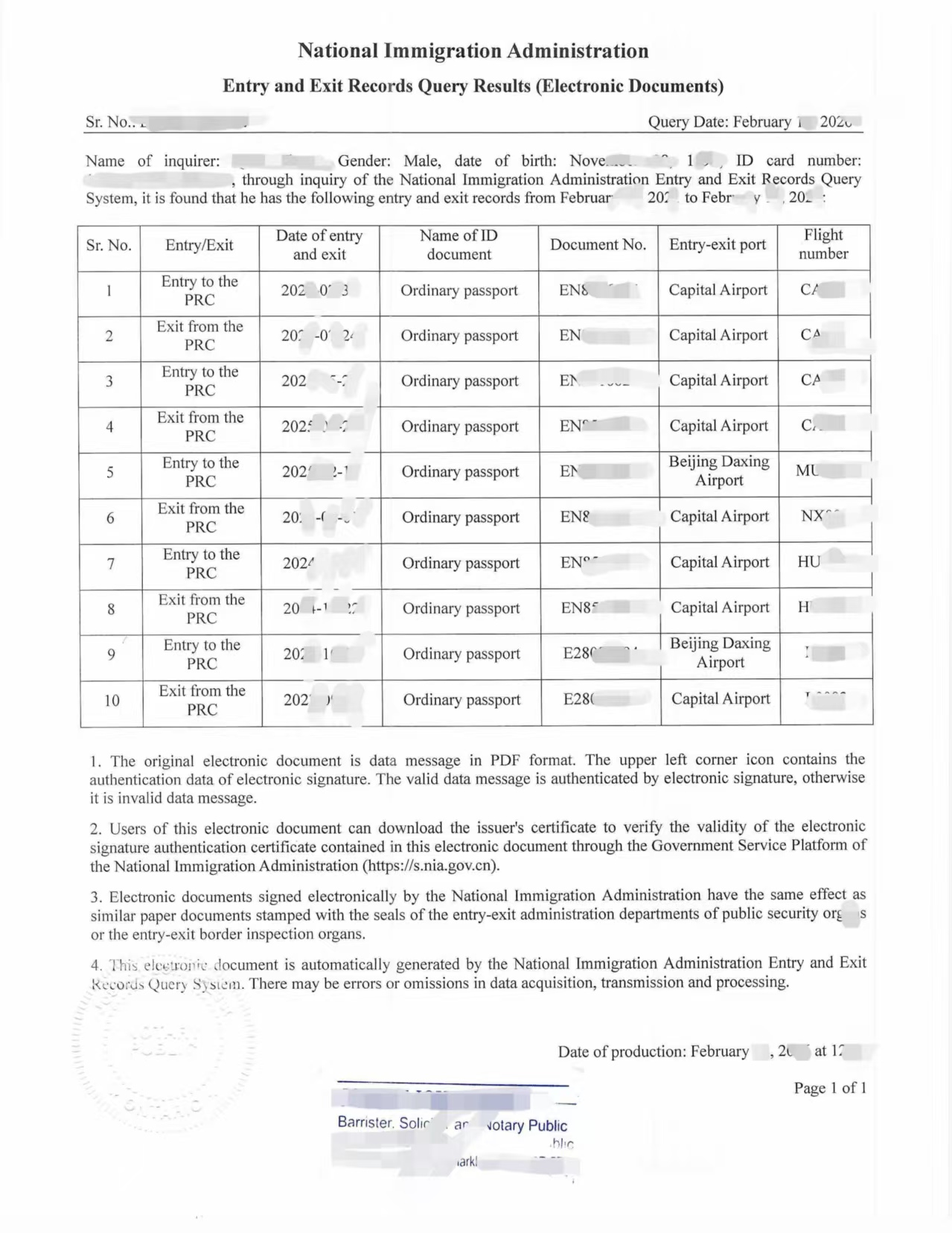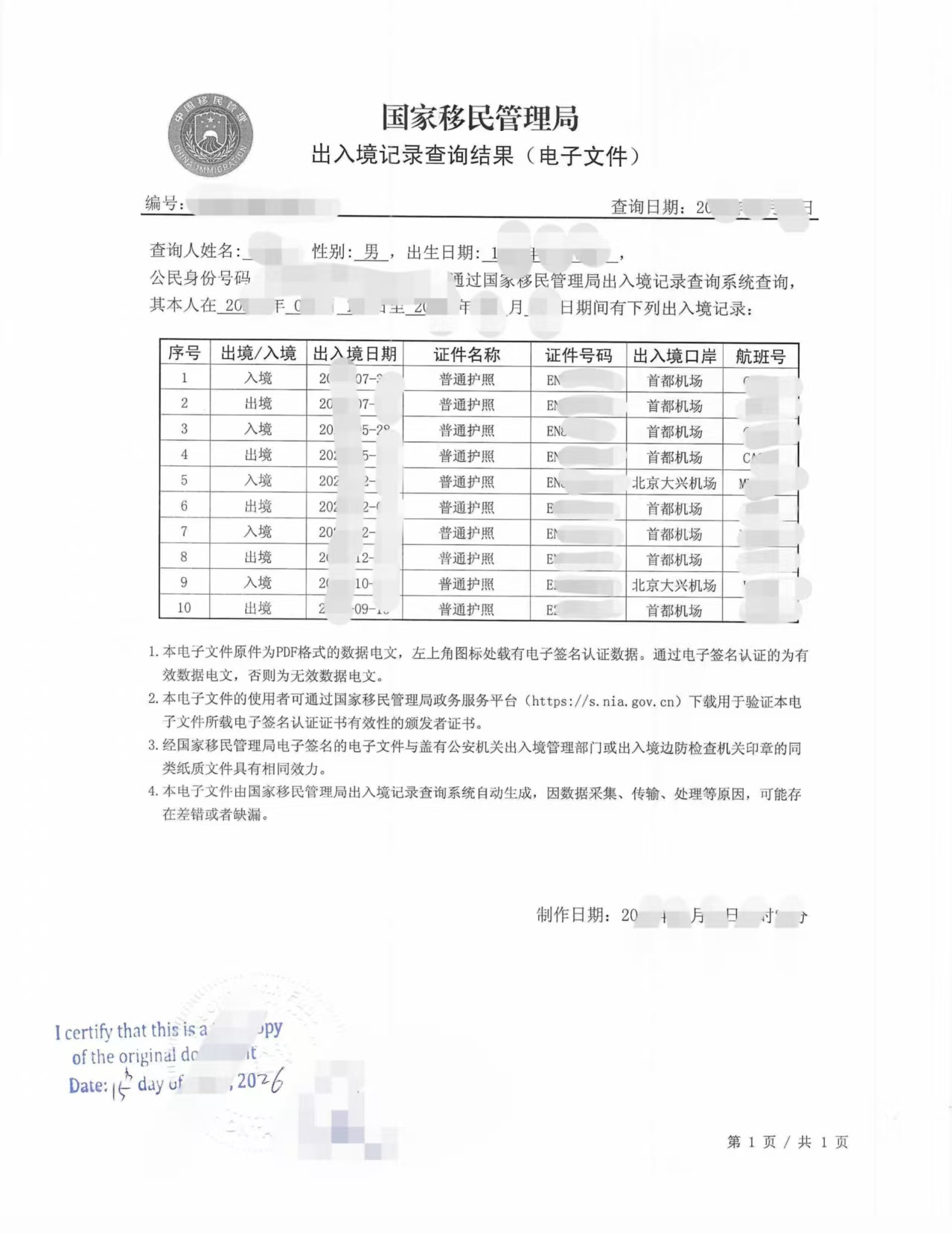 客户已自行在国家移民管理局官网下载《出入境记录查询结果(电子文件)》。但签证材料必须为英文版本,且需要附翻译宣誓页及公证页,确保文件真实性与完整性。