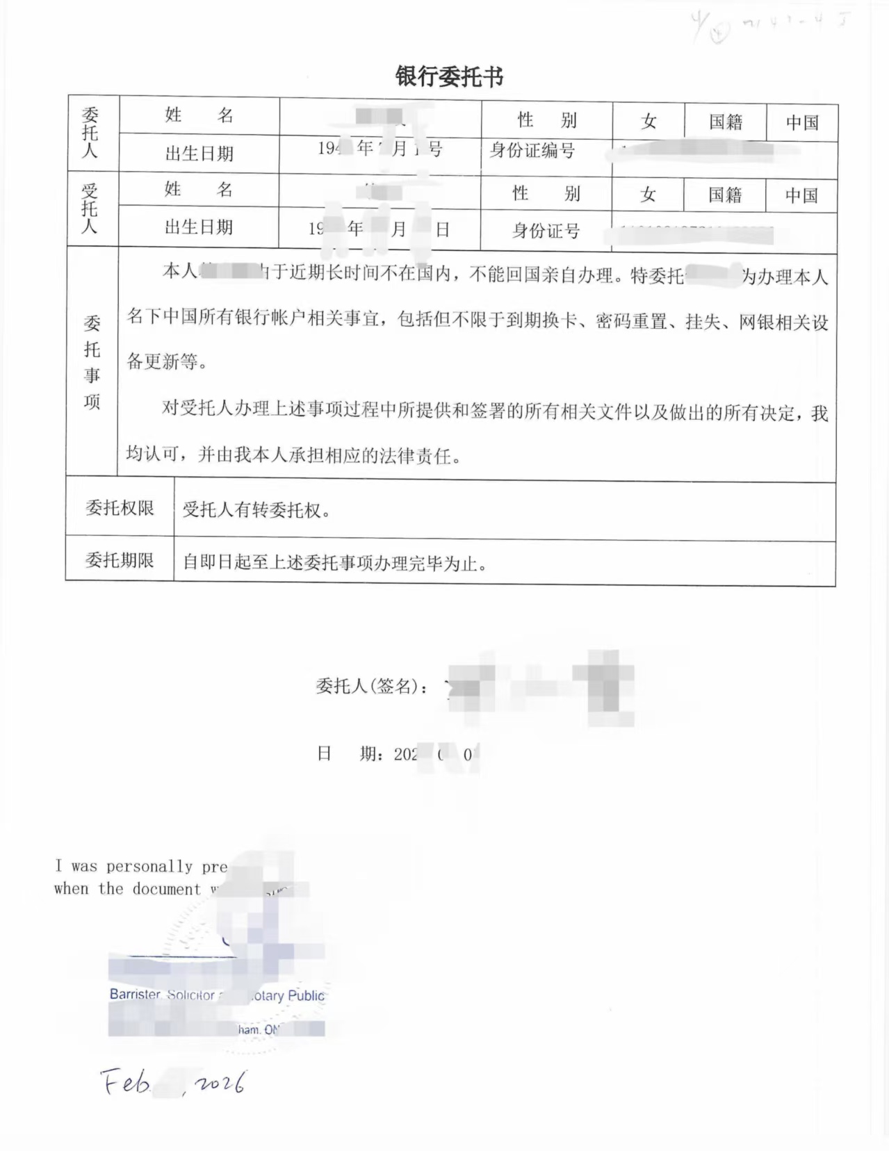 委托书签署日期为2026年2月1日,随后在安省 Notary Public 面前完成签字见证。公证人确认签字真实性。