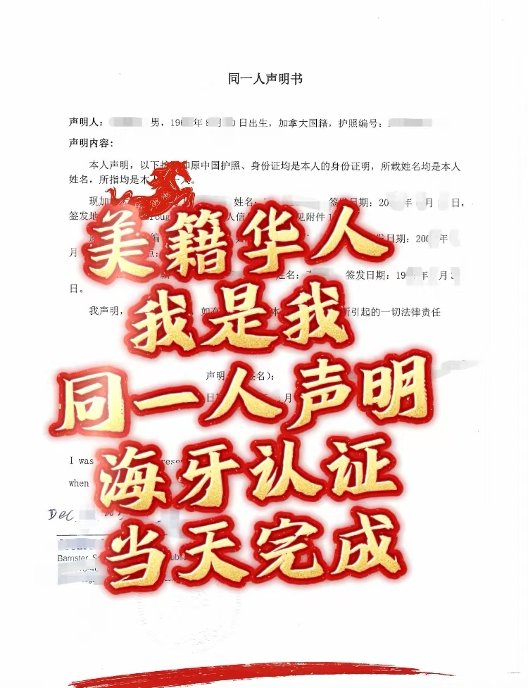 美籍华人回国办理房产、银行、继承等事务时,常因身份信息不一致受阻,同一人声明书是证明 “我是我” 的关键文件,经海牙认证后可在国内合法使用。