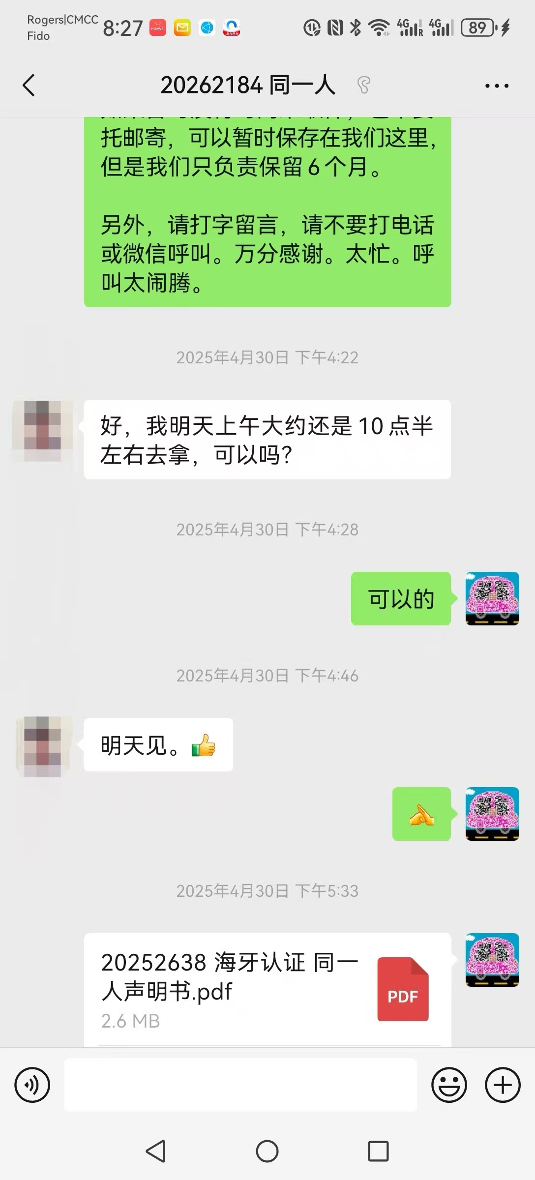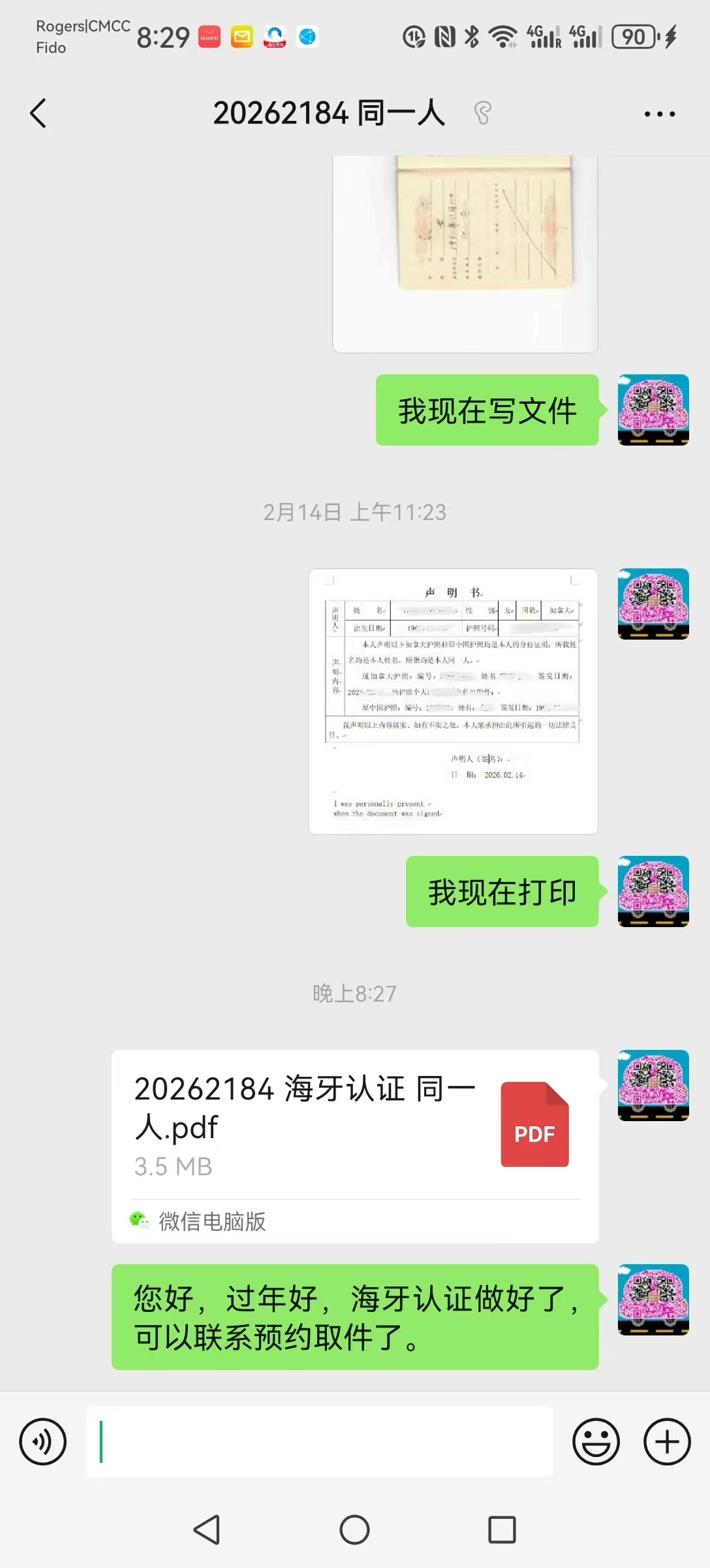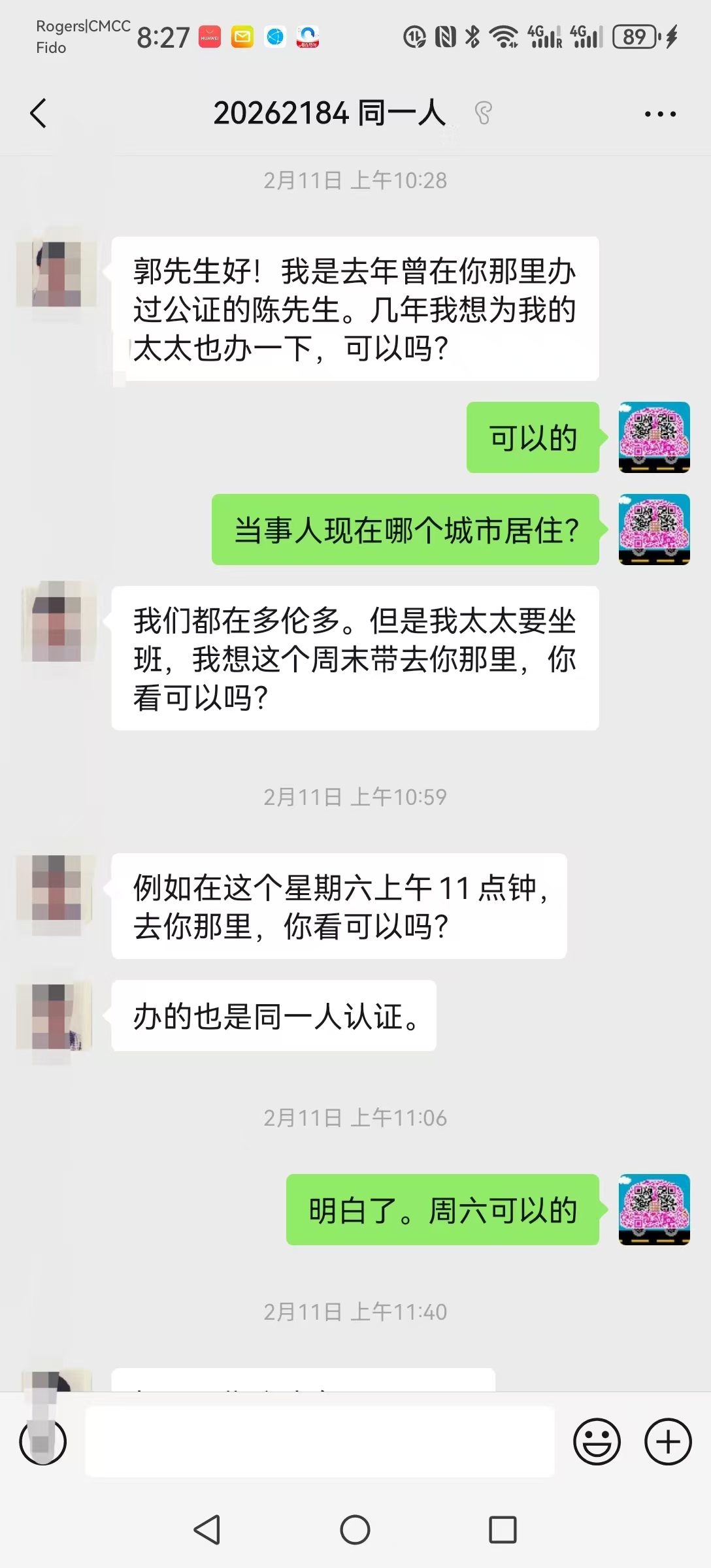 去年,陈先生在我们这里办理过两份同一人声明书海牙认证,用于国内房产及身份衔接事项。今年2月,他再次联系:“郭先生好!我是去年曾在你那里办过公证的陈先生。几年我想为我的太太也办一下,可以吗?”从聊天记录可以看到,他对流程非常熟悉,直接说明“办的也是同一人认证”,并主动预约周六上午到场签署。