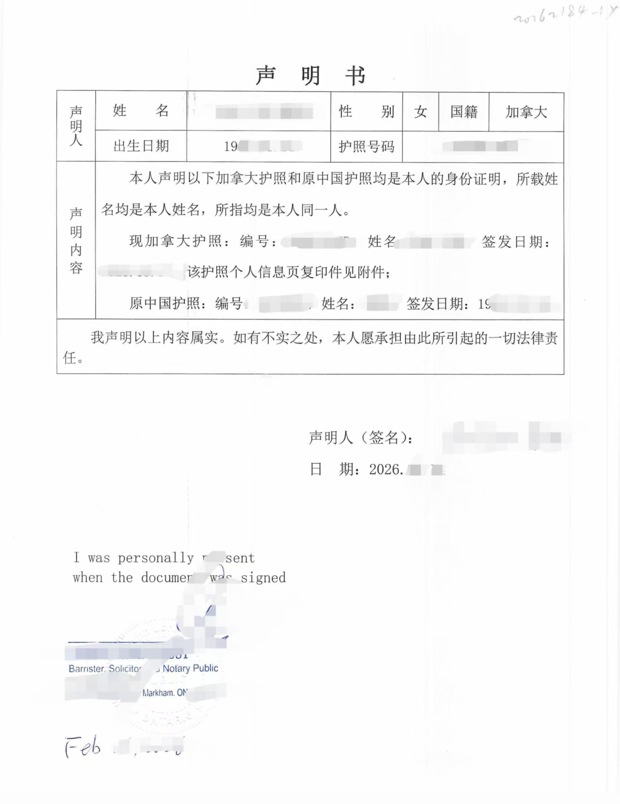 本案的关键并不在技术复杂度,而在连续性与一致性。去年先生办理时,我们已对家庭情况、姓名拼写、旧护照信息做过完整记录。今年为太太起草文件时,我们再次逐项核对拼音顺序、签名格式、出生日期表达方式,确保夫妻两人的声明逻辑一致,避免日后在国内不同部门使用时出现标准不统一的问题。