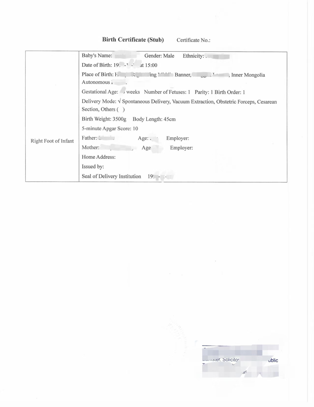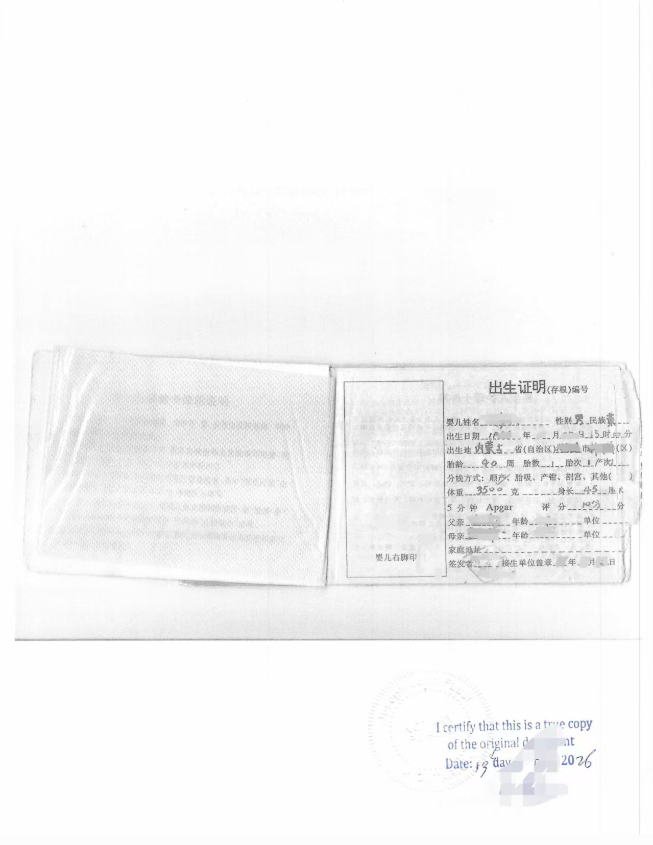 客户提供的是90年代签发的老式出生证,为小册子形式,内容为手写填写,包括: