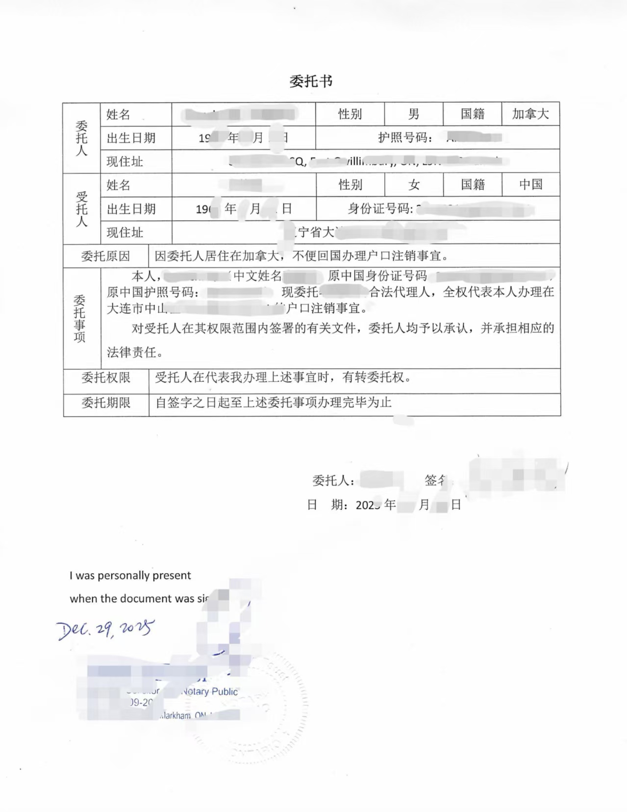 近期,办理定居加拿大约克顿的冯先生(化名)因移民手续,需注销江西宜春户籍委托书公证与海牙认证手续,介于冯先生工作繁忙无法回国,特委托国内白女士(化名)代办。华译网提供跨国公证认证一站式远程服务,全程无需本人往返,高效合规完成户口注销委托手续。