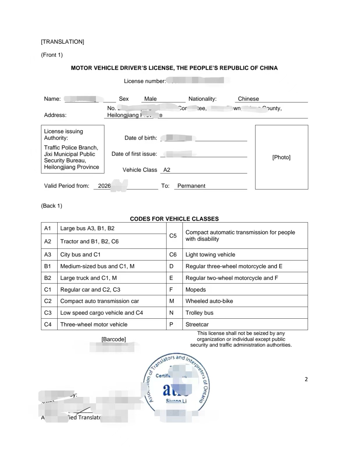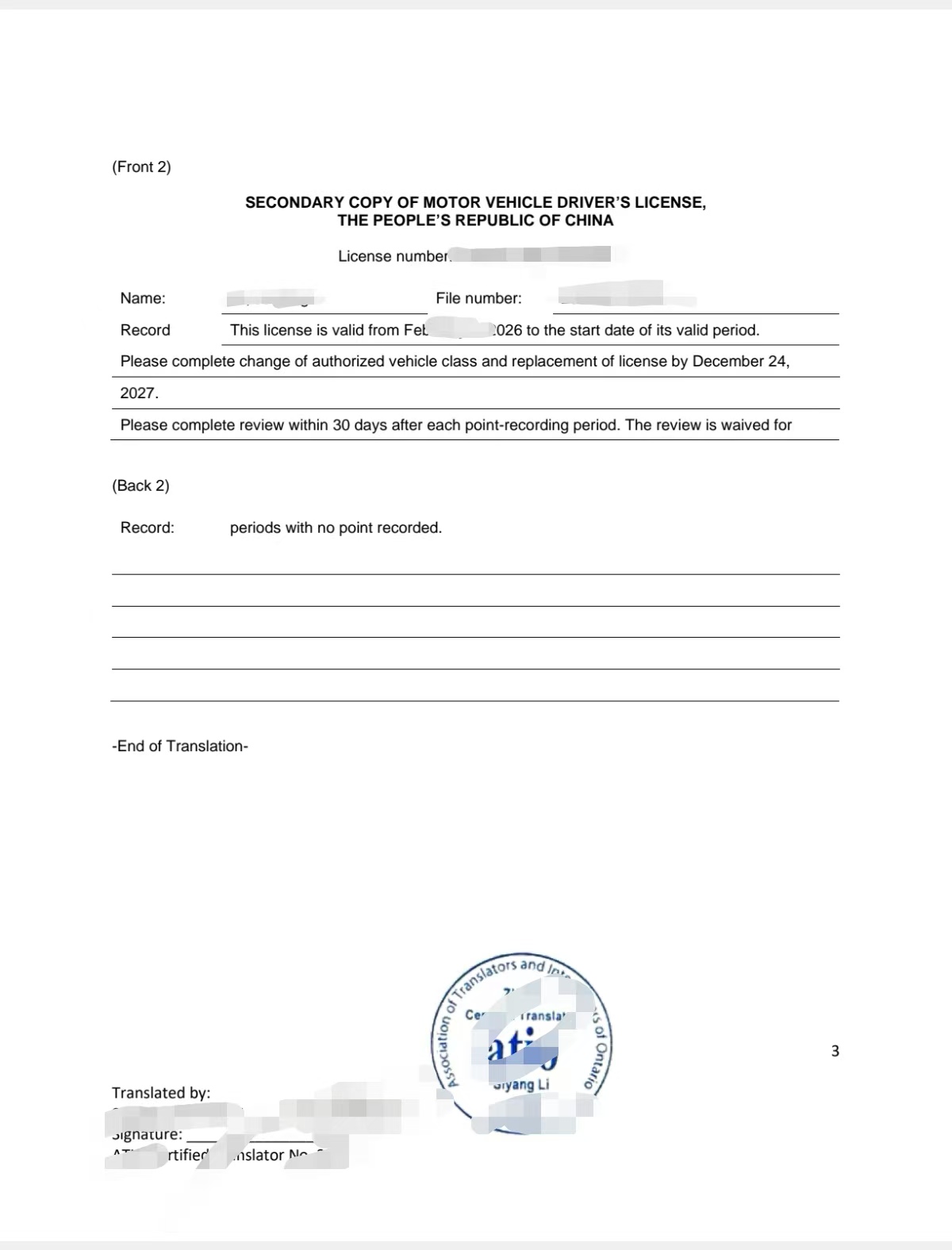 中国驾驶证经持牌认证翻译直接考加拿大考G2