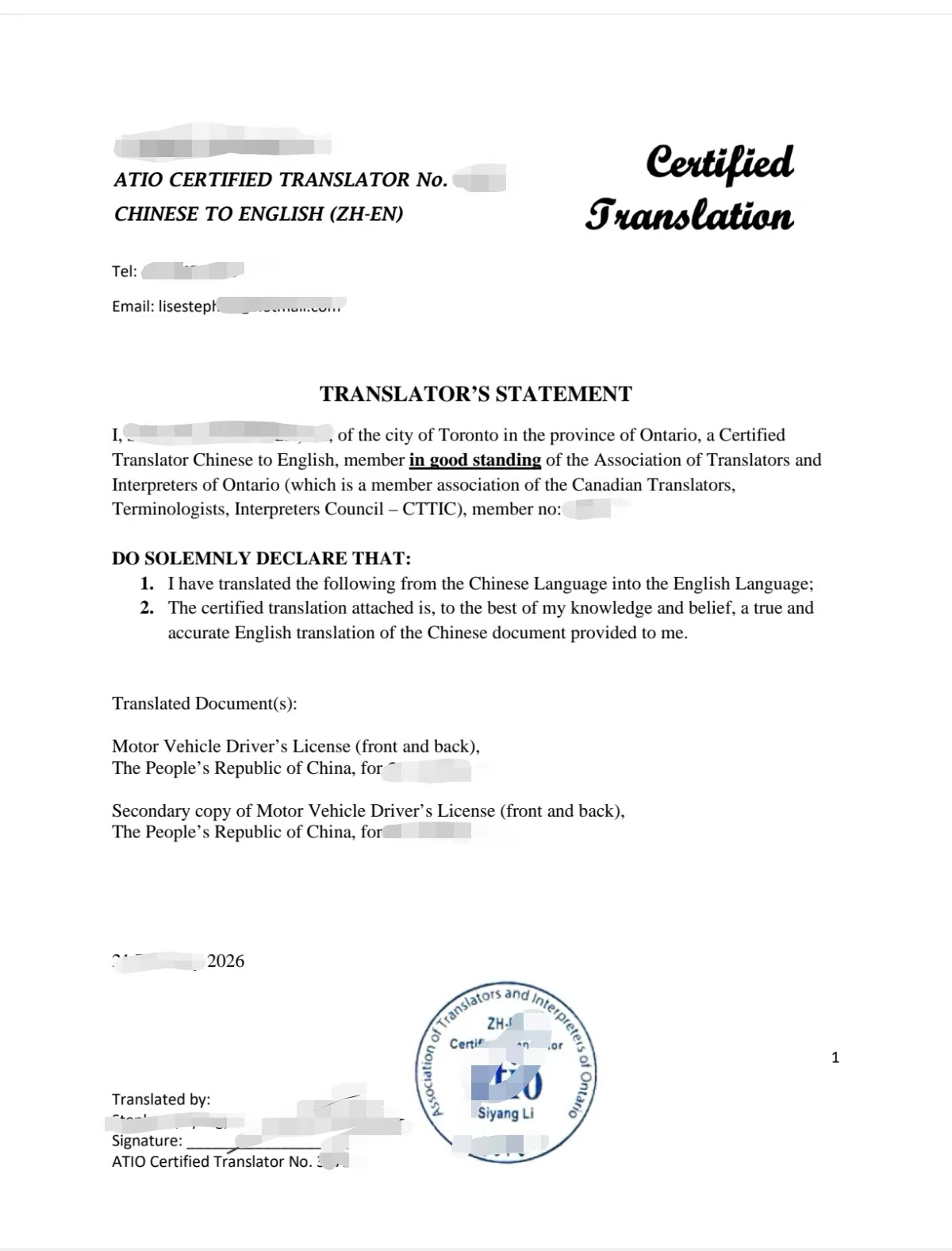 例如我们近期完成的一份中国驾驶证翻译件,第1页为认证翻译声明,第2页清晰列明:
