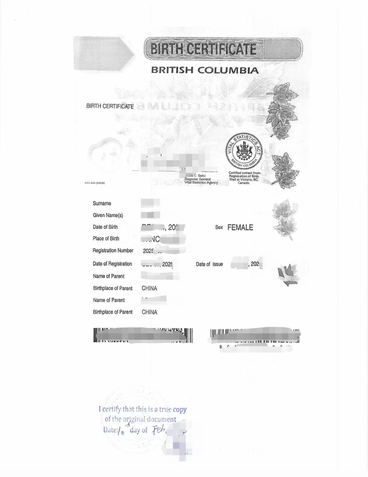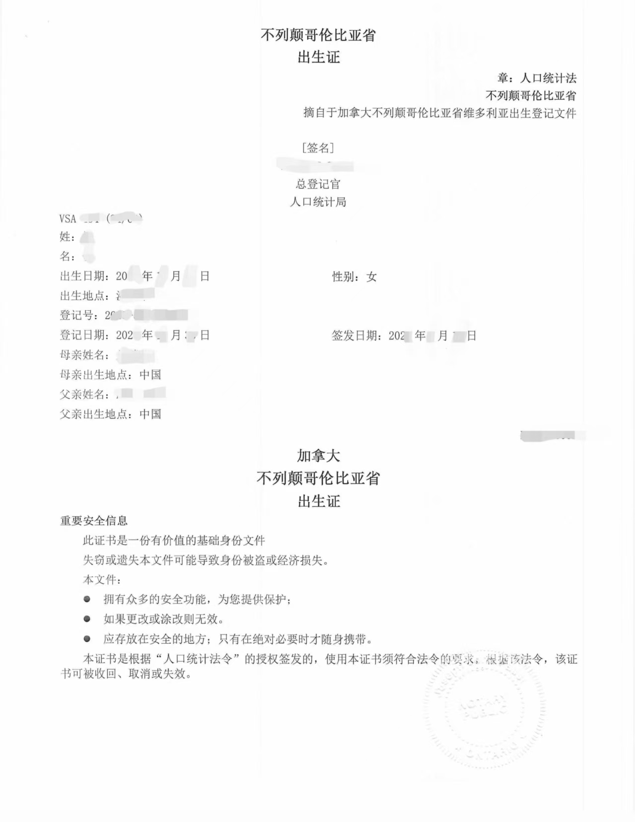 这是一份刚刚完成的案例:不列颠哥伦比亚省(BC省)出生证,在安省多伦多办理海牙认证,当天完成。