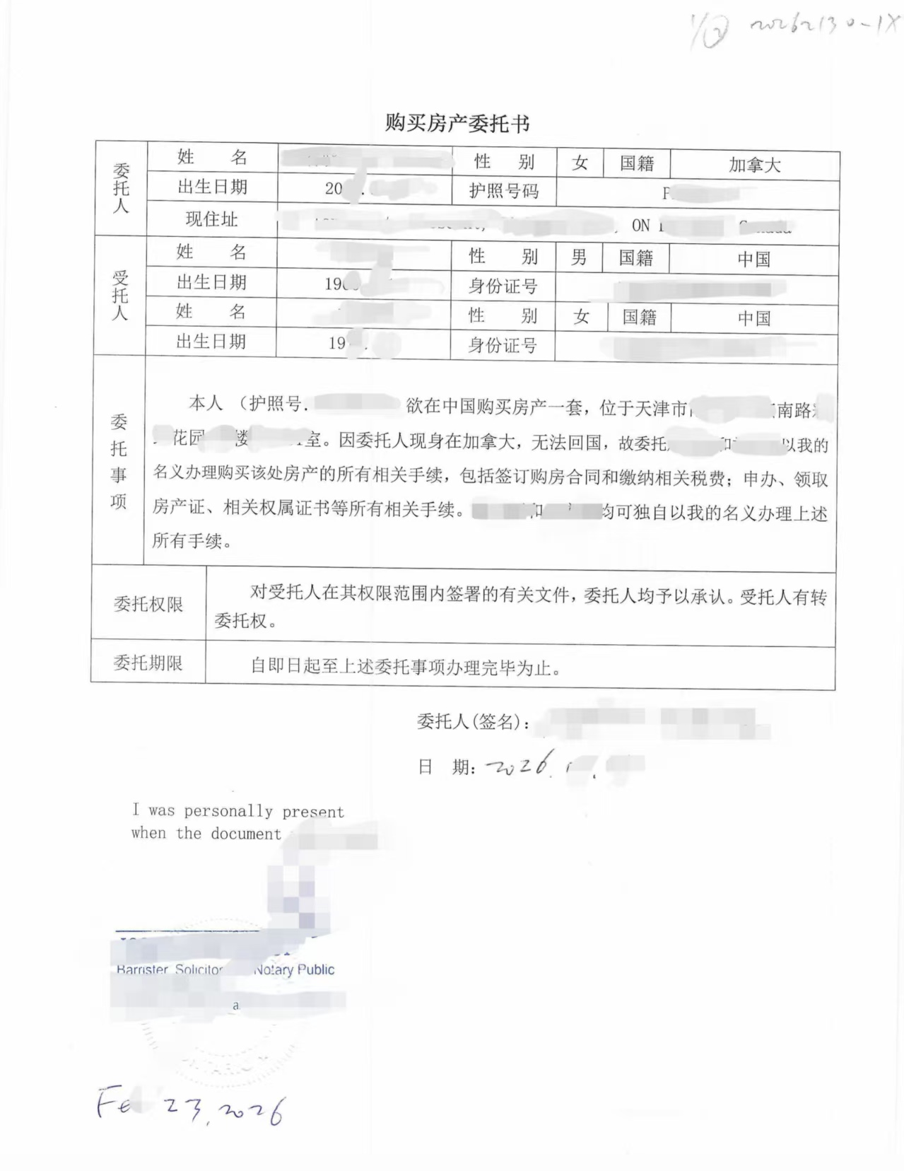 近日,我们完成一份购房委托书海牙认证。委托人为加拿大籍华人,长期居住在安省,因工作原因无法回国,需在中国购买住宅一套,因此授权国内亲属代为办理相关手续。