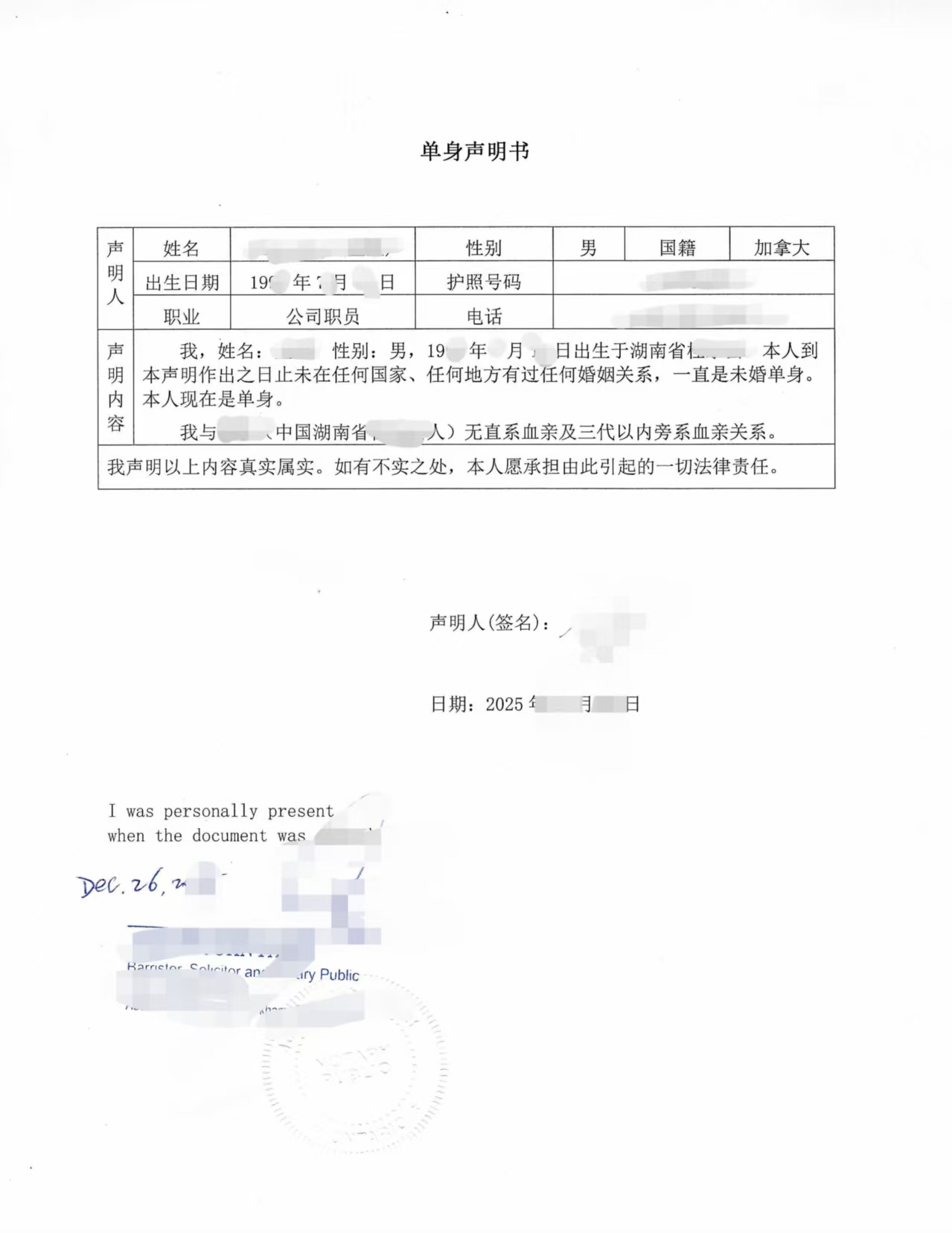 加拿大万锦单身证明声明书海牙认证登记结婚