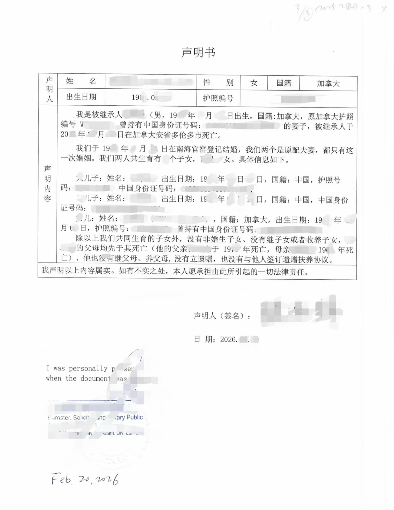 这次委托我们的,是一位长期居住在加拿大的母亲。丈夫在加拿大去世,国内尚有财产及后续手续需要办理。根据国内相关单位要求,需要由配偶出具声明书,详细说明婚姻情况、子女情况以及是否存在其他法定继承人。