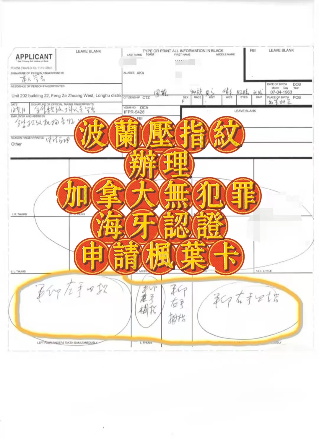 客户在波兰当地警方或专业机构压指纹,华译网提供加拿大皇家骑警(RCMP)认可的标准指纹卡样板及填写指导 。