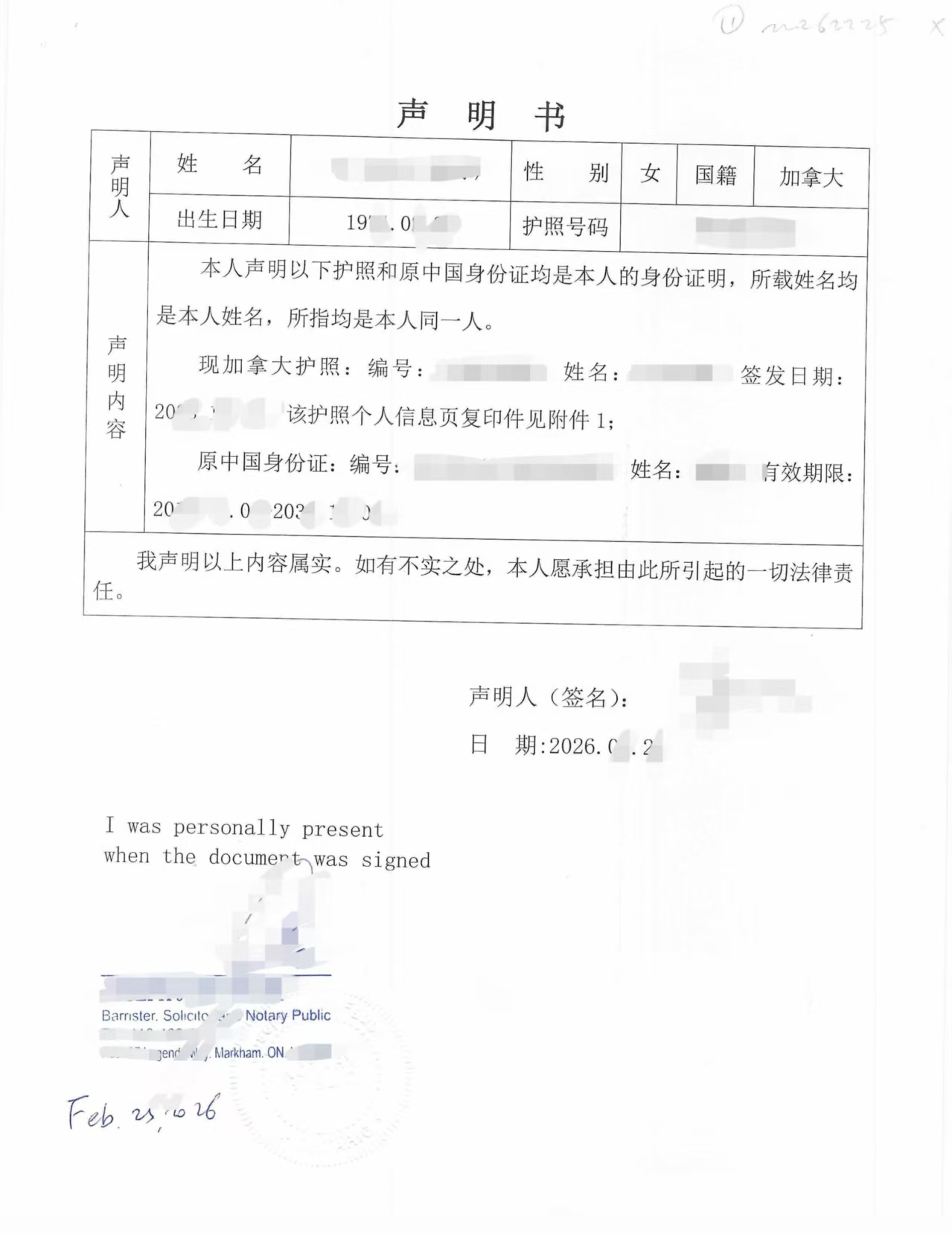 当事人现场签署声明书,由安省持牌律师 Notary Public 见证签字并加盖执业印章。