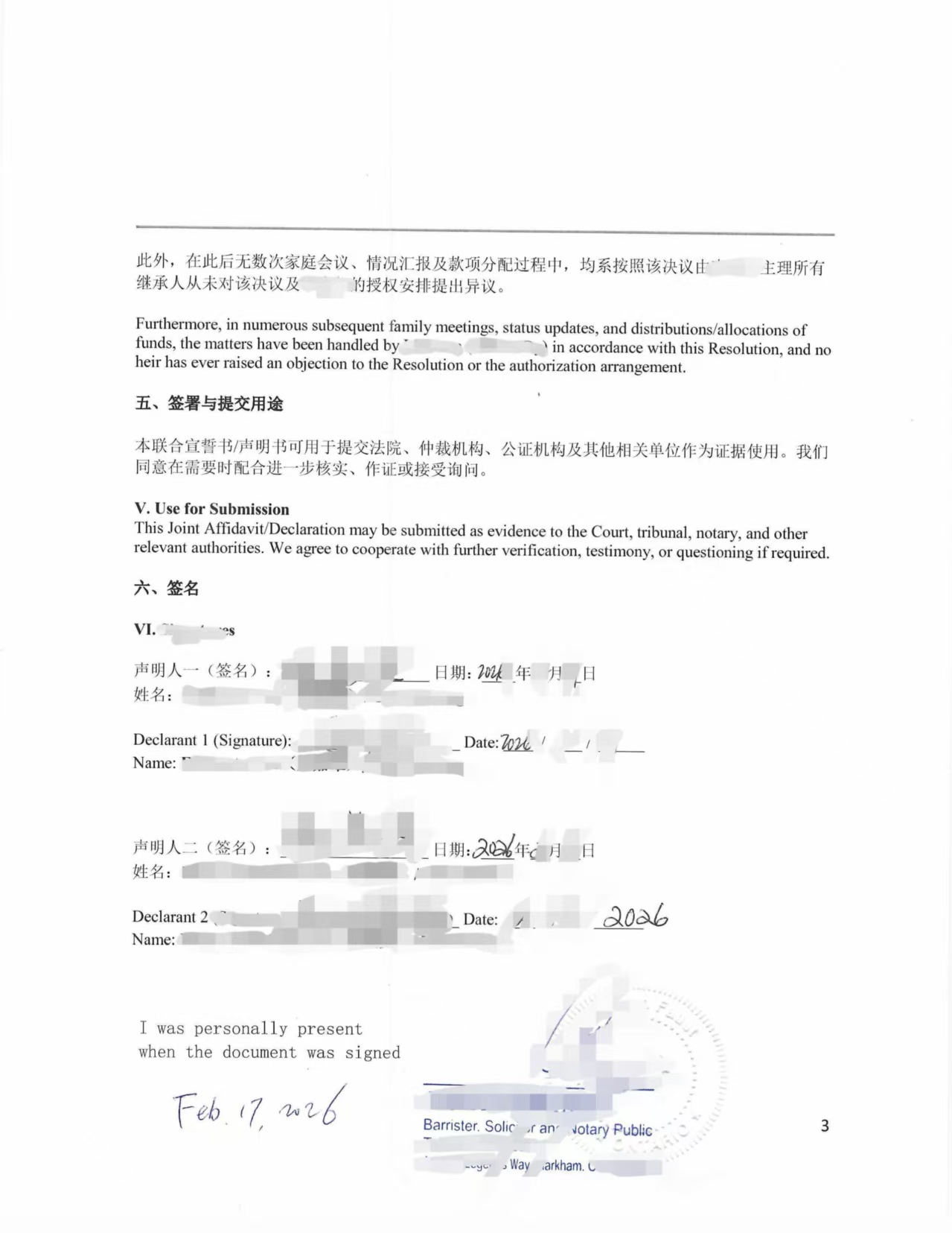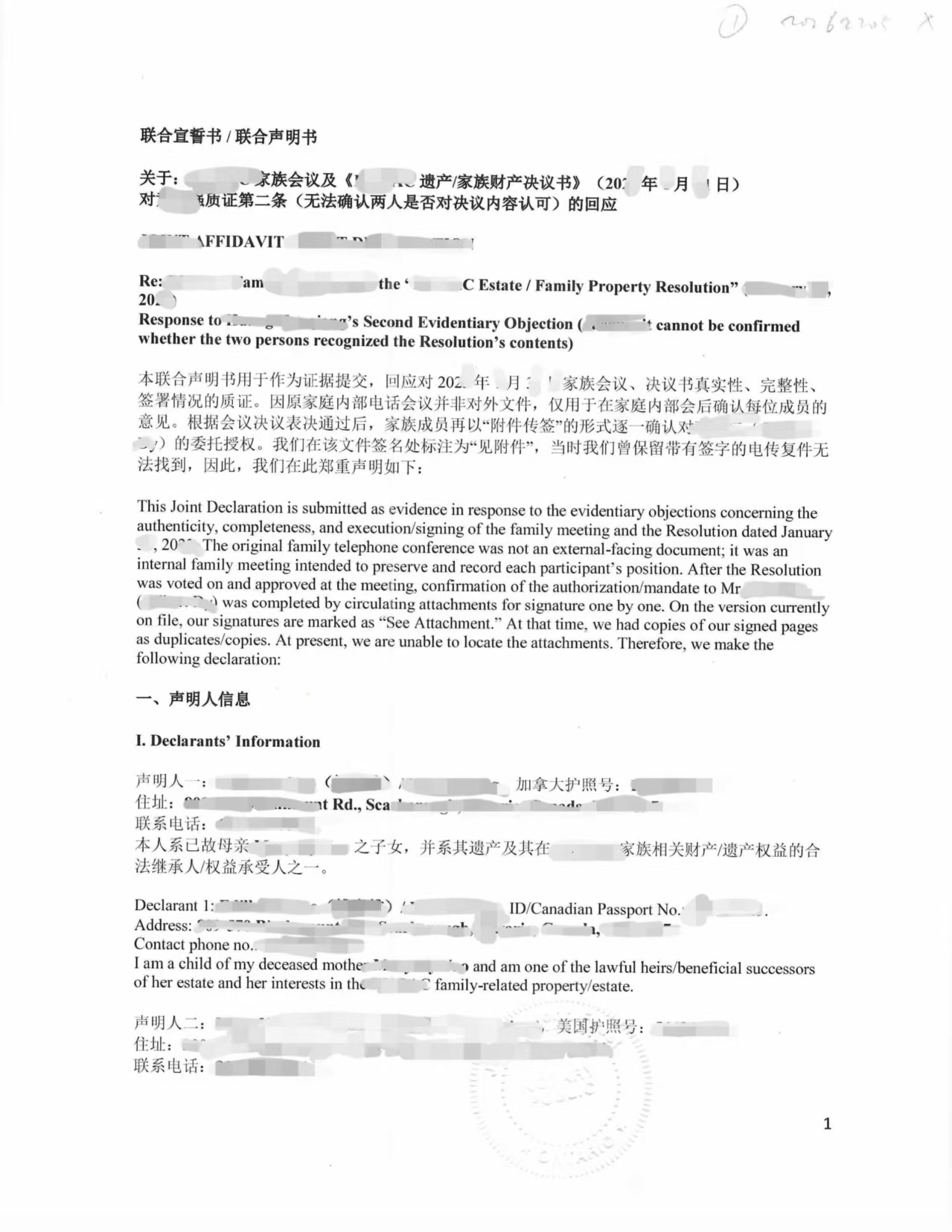 本案的特殊性在于:两位当事人分别身处不同国家,一位在美国加州,另一位在加拿大安省;声明内容为共同确认某次家族会议决议真实、有效,并对授权代表处理遗产事项予以认可。文件需两人共同签署,且签名真实性必须分别完成律师核验。