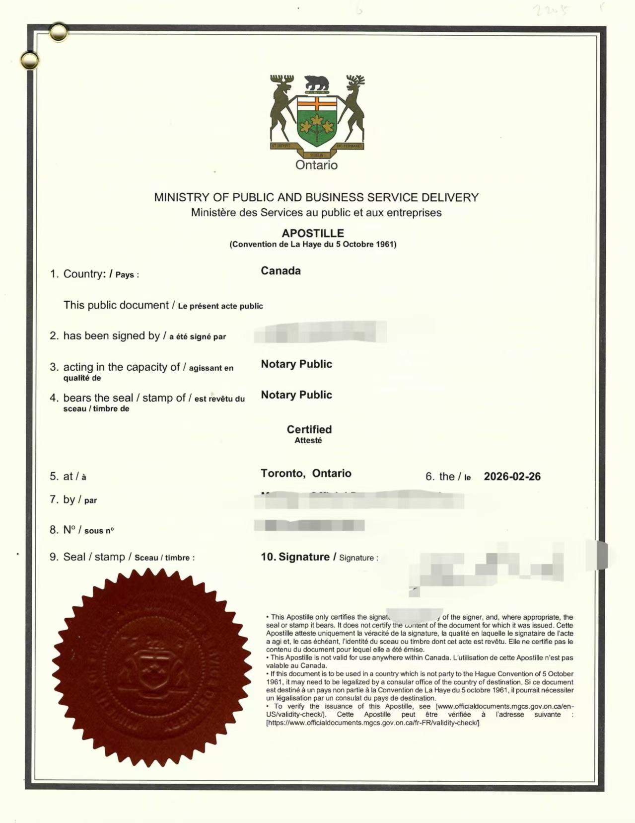 两位签署完成后,我们当日整理完整文件包,随即递交安省政府办理海牙认证。当天顺利完成Apostille,文件加盖红色钢印,认证编号清晰可查。整个流程从确认文本到完成海牙认证,仅用一天时间。