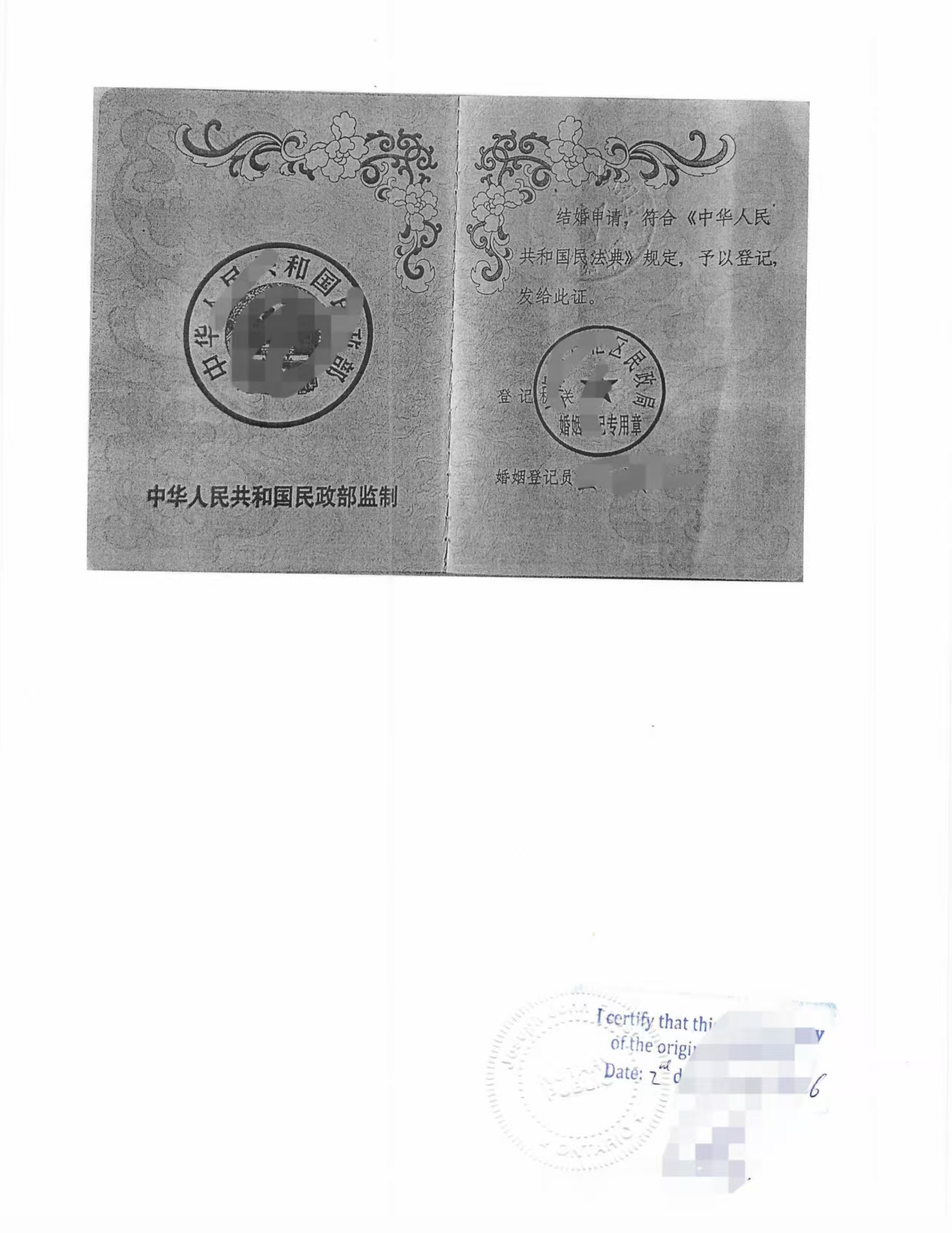 这是一个非常典型的场景——中国民政局领取的结婚证,用于加拿大境内申请配偶工签(Spousal Open Work Permit)。材料必须包含:结婚证扫描件、英文翻译件、翻译宣誓书(Affidavit)、律师公证页,部分情况下还需附原件复印件认证。