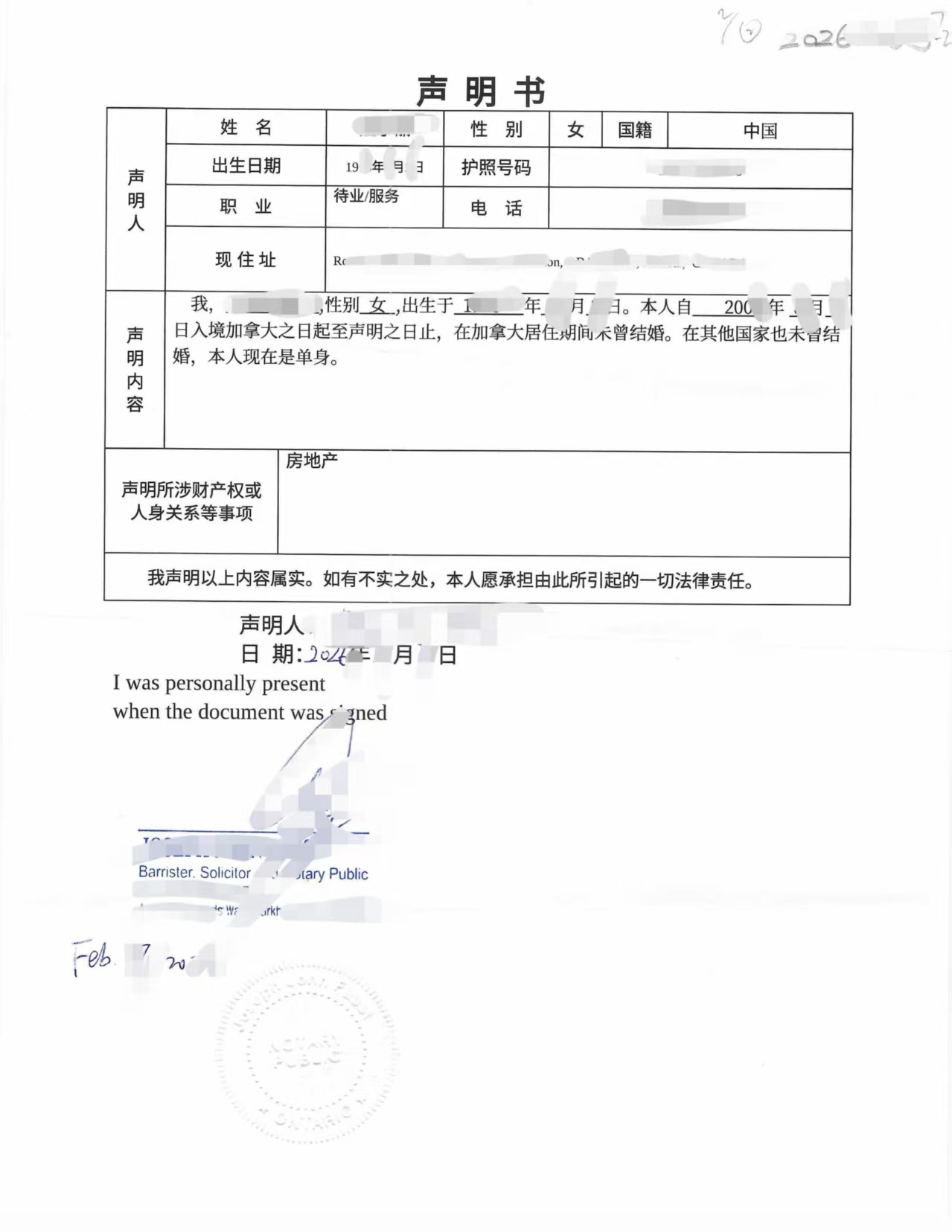 客户本人目前居住在加拿大阿尔伯塔省,但继承房产在中国。根据国内办理继承公证的要求,如果继承人是单身状态,通常需要提供一份单身声明书,说明婚姻状况,以避免未来可能出现的继承纠纷。