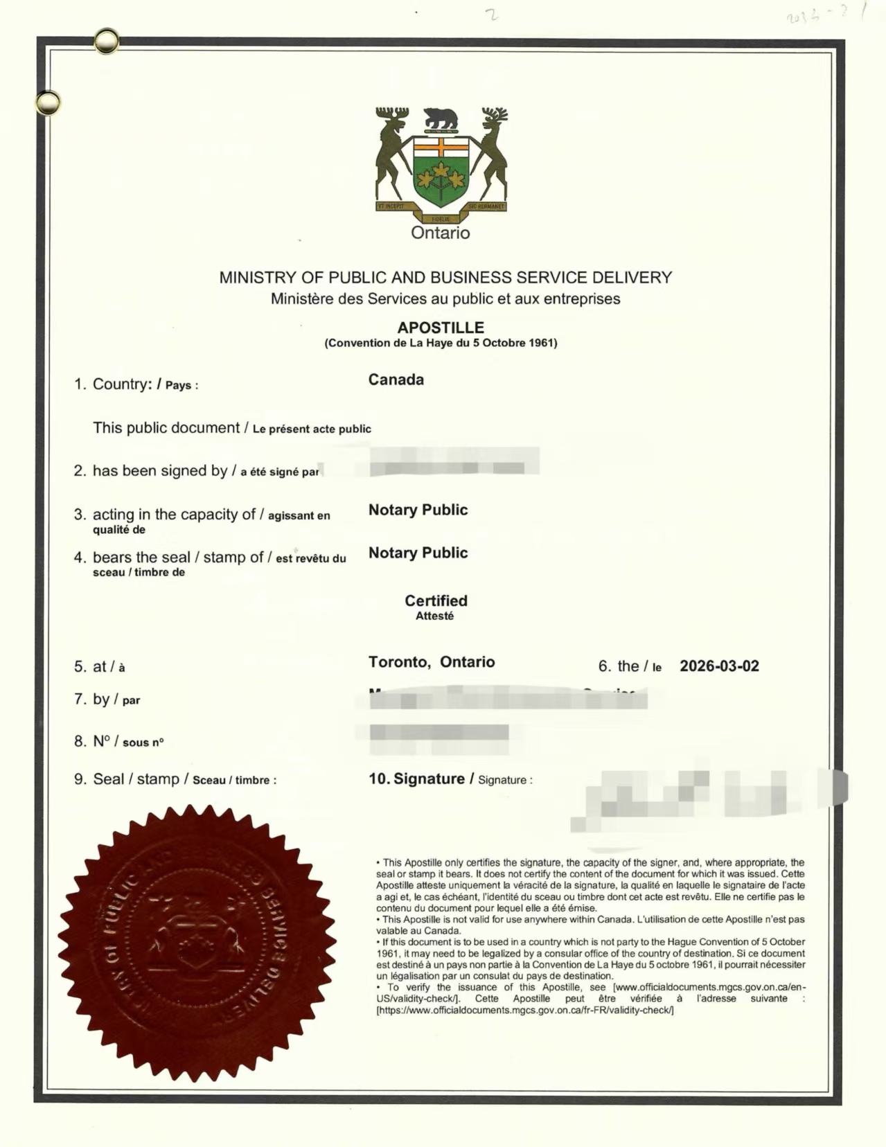 律师现场公证文件后,华译网直接将文书递交至安大略省政府服务厅,办理了海牙认证(Apostille)。这关键的一步确认了签字的真实性,使其具备了跨国法律效力 。