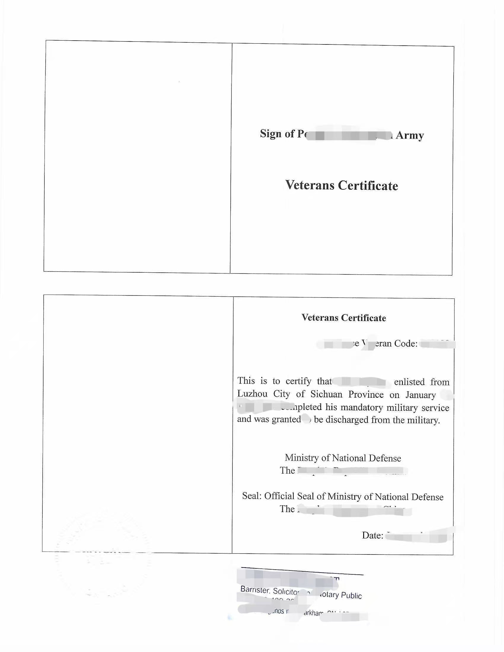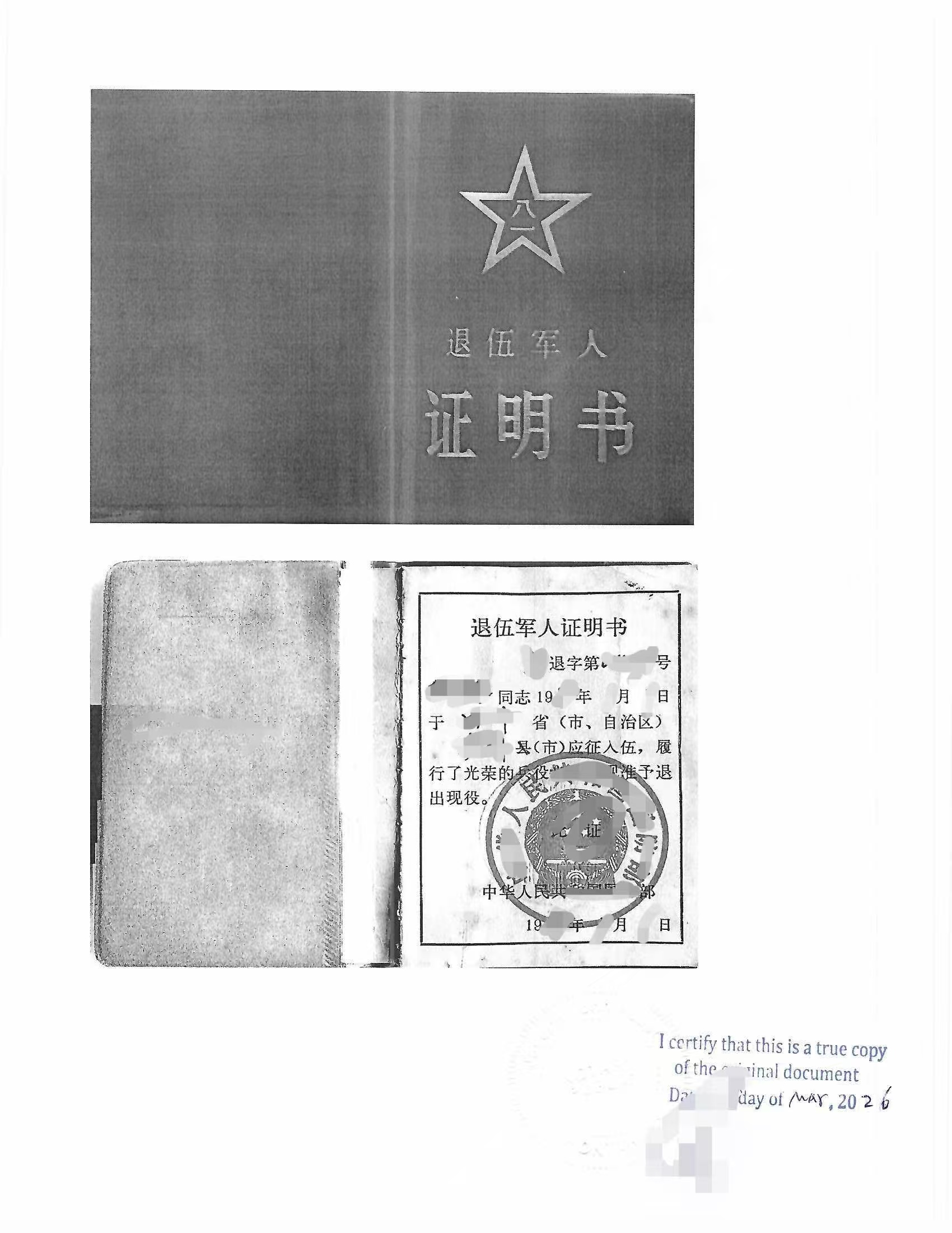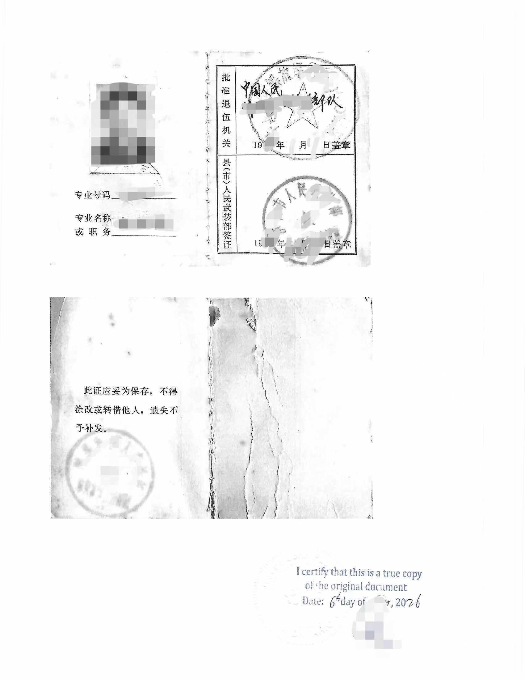 最近完成一份 中国退伍军人证明书翻译公证,用于 加拿大父母团聚移民(Family Sponsorship)补充材料。客户时间比较紧,希望尽快提交给移民局,我们当天完成翻译、公证并出具扫描件。