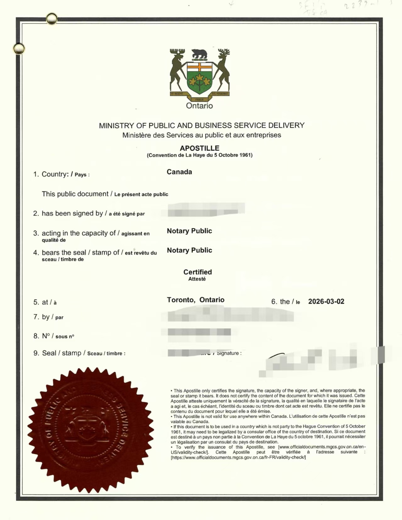 客户目前人在北京,无法来加拿大办理。通过朋友介绍联系到我们后,决定远程委托办理。我们在多伦多协助准备声明书文本、安排律师见证签署,并完成公证及安省政府海牙认证流程。
