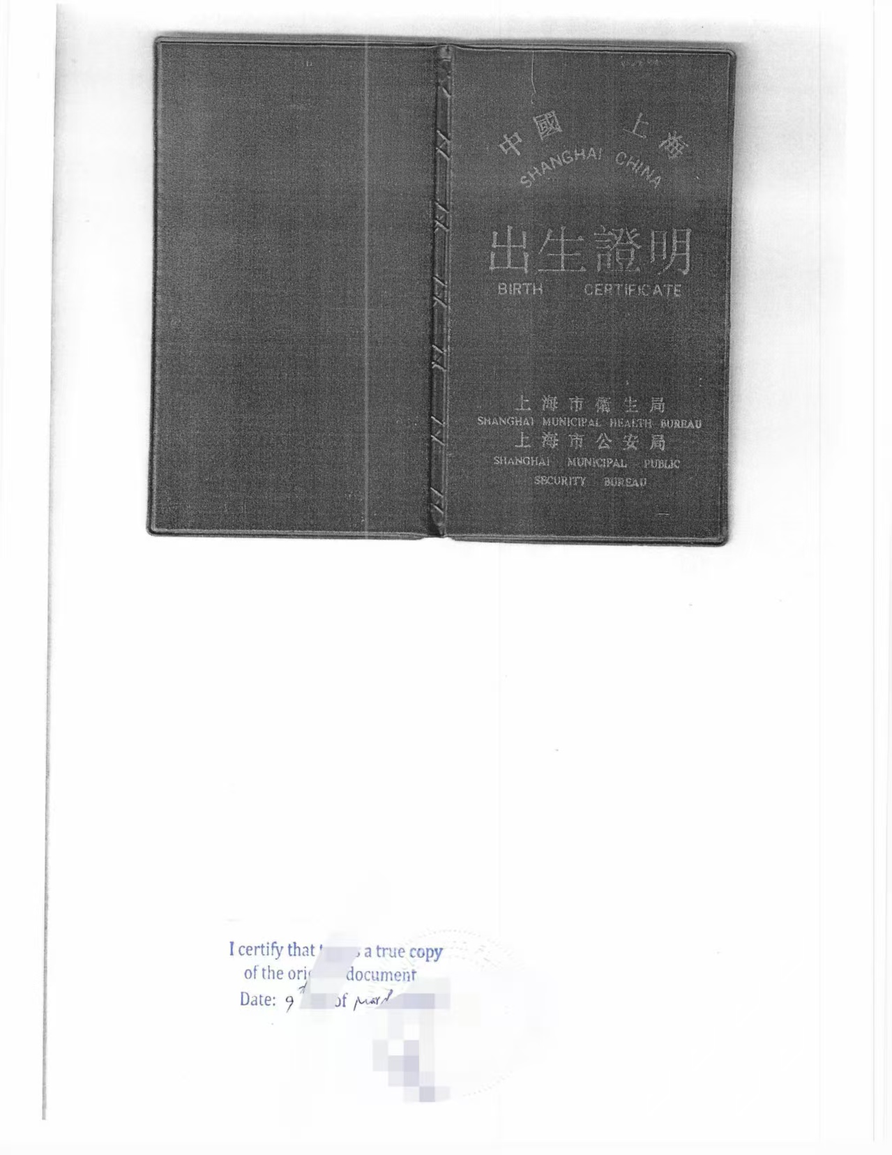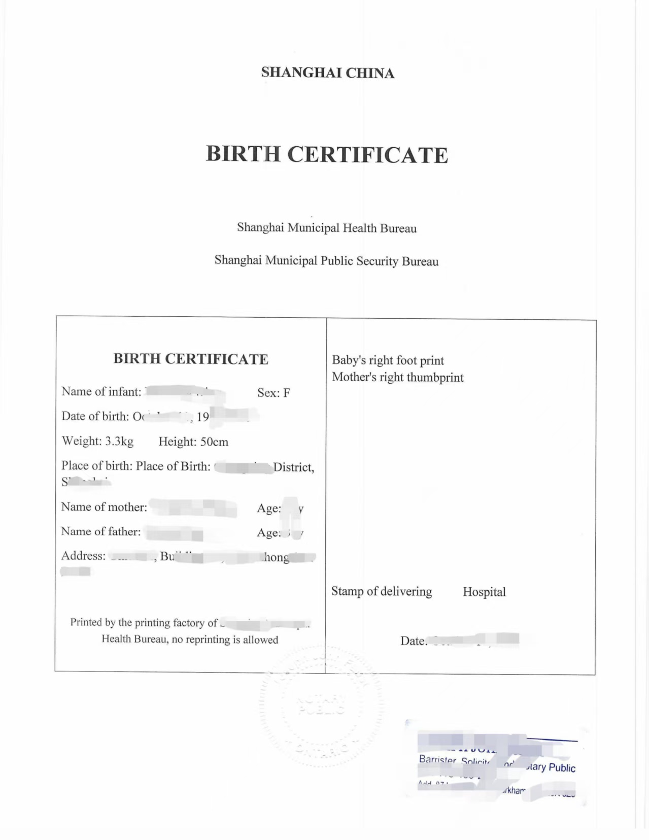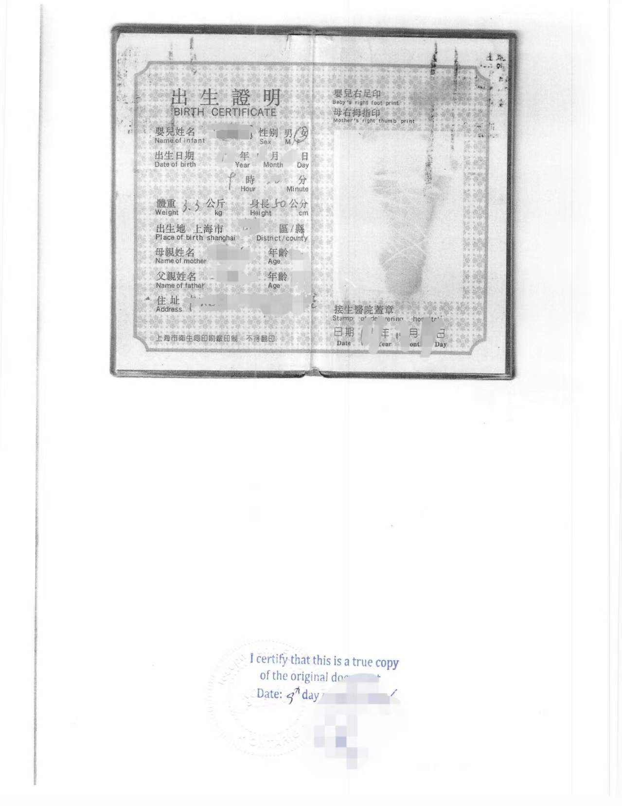 这位客户出生于上海,是90年代常见的一种小册子式《出生证明》,封面写有“中国上海 出生证明”,由上海市卫生局和上海市公安局联合签发。证件中记录了出生时间、出生地点、父母姓名、出生体重身高等信息,并附有婴儿脚印和母亲拇指印等内容。