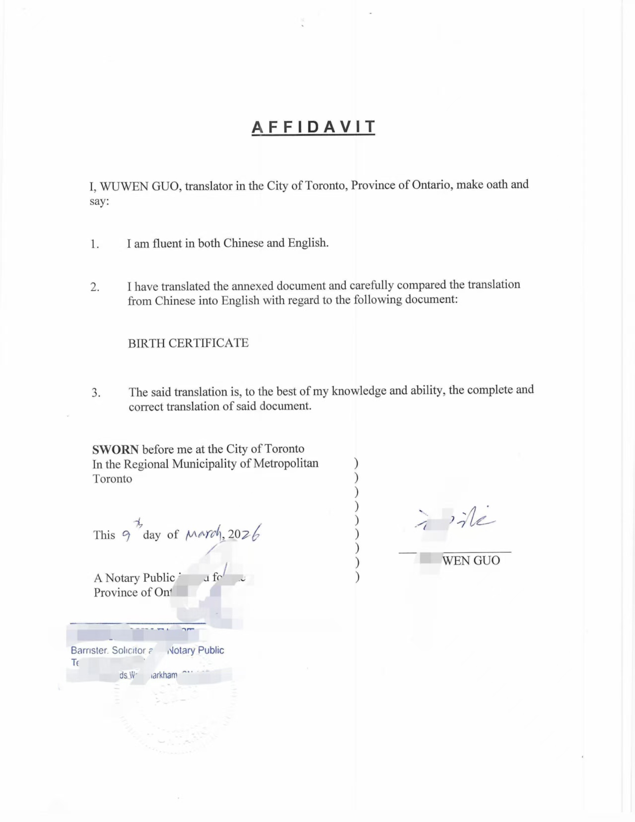 翻译员签署 Affidavit of Translator(译者宣誓书)