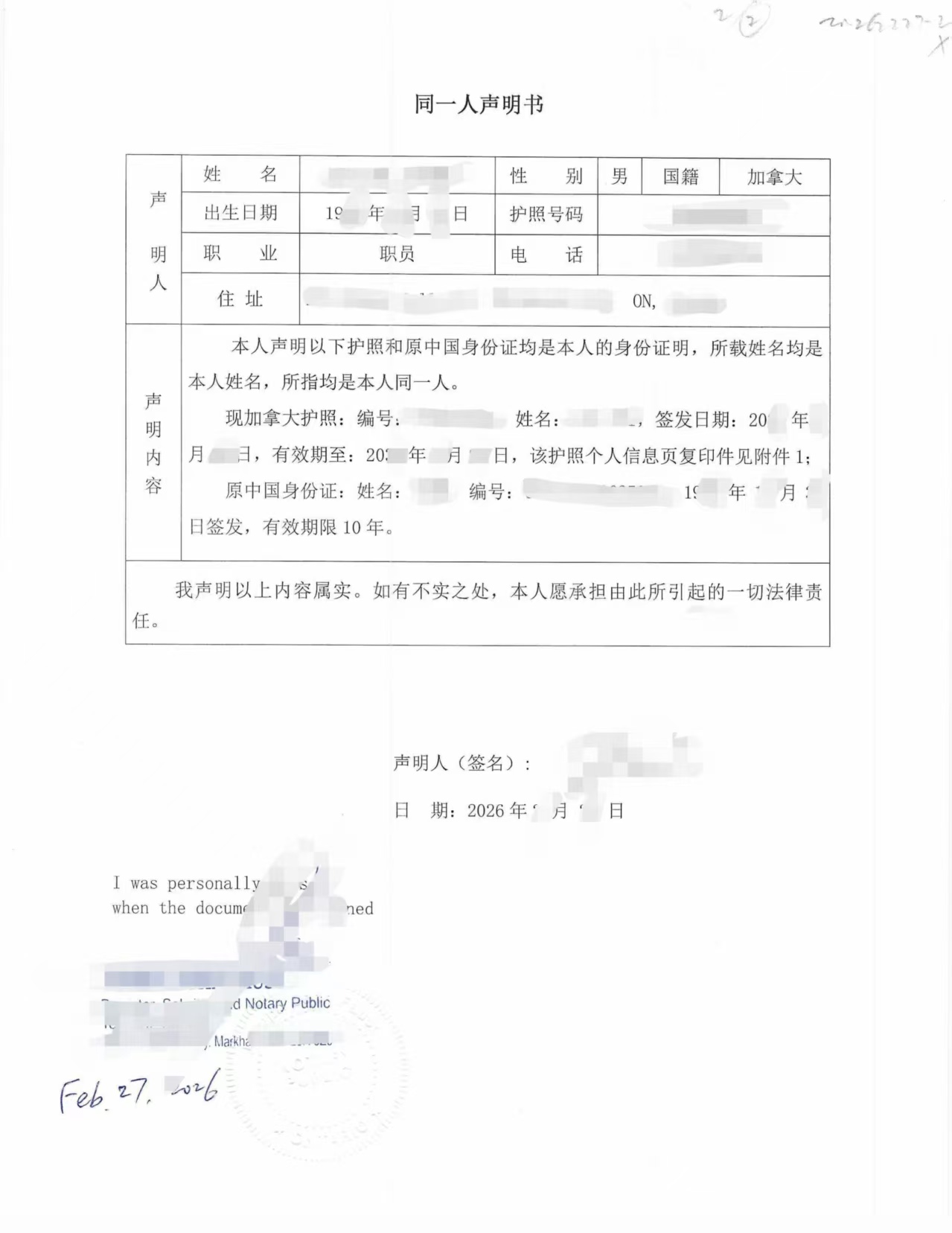 当事人联系到我们时表示比较着急,因为国内继承手续已经在办理过程中,公证处和不动产部门要求补充“同一人证明”。我们根据其中国身份证信息、加拿大护照信息以及个人情况,协助起草了同一人声明书,并安排公证人见证签字。