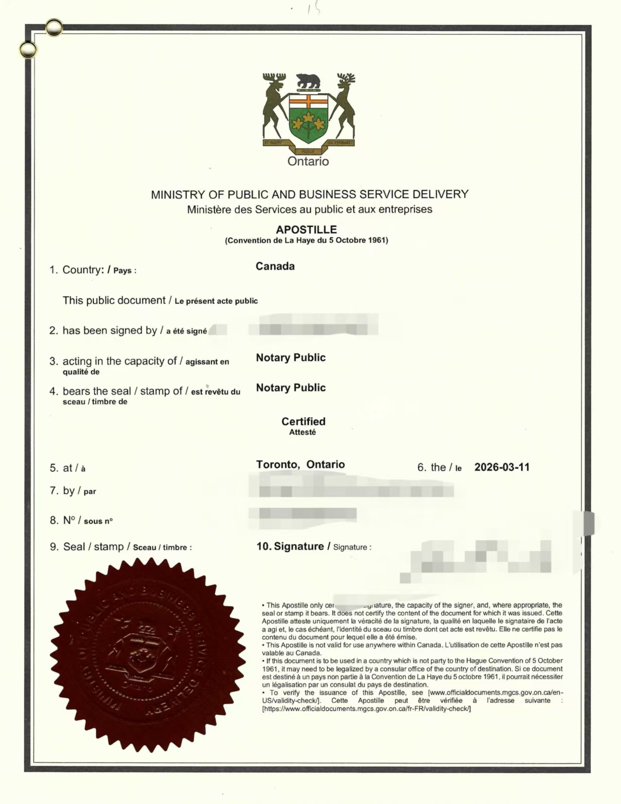 完成公证后,我们立即安排办理加拿大海牙认证(Apostille)。认证由安省政府签发,在附加证明书上注明文件签署人、公证人身份、认证地点以及认证日期等信息。文件显示该海牙认证在多伦多签发,并由官方文件服务部门负责人签署。