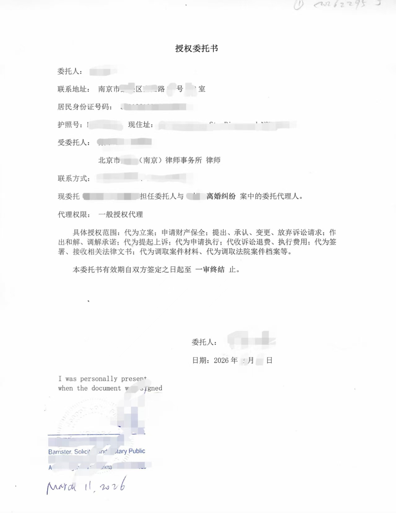 近期一位客户因南京离婚纠纷诉讼,需要委托中国律师代为出庭处理案件。当事人长期居住在海外,无法回国办理相关手续,因此委托我们协助办理授权委托书公证及海牙认证(Apostille)。