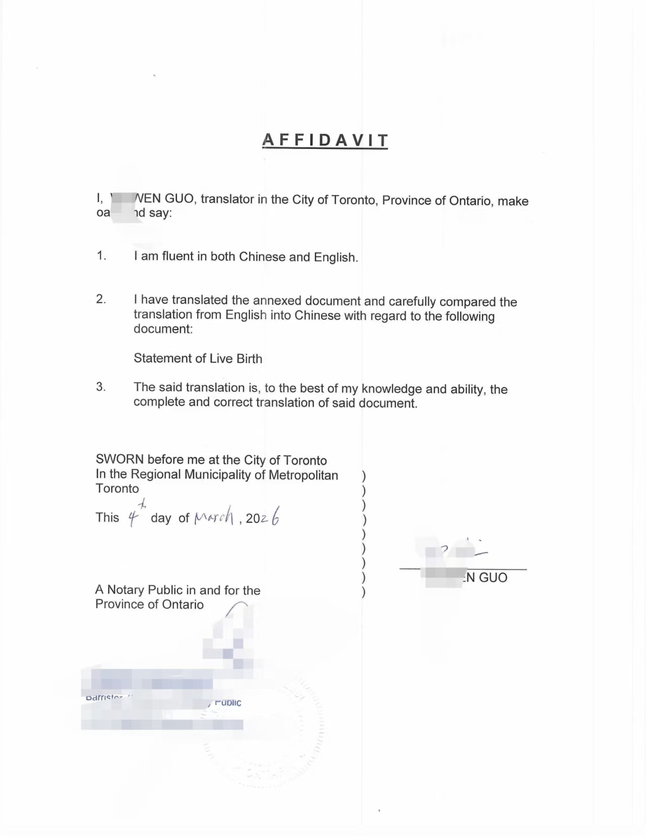 在办理过程中,我们首先完成出生证明英译中翻译,并由翻译人员出具翻译宣誓声明(Affidavit)。翻译宣誓文件中说明翻译人员精通中英文,并确认译文为对原文件的完整准确翻译。随后由安省公证人对翻译宣誓进行公证。