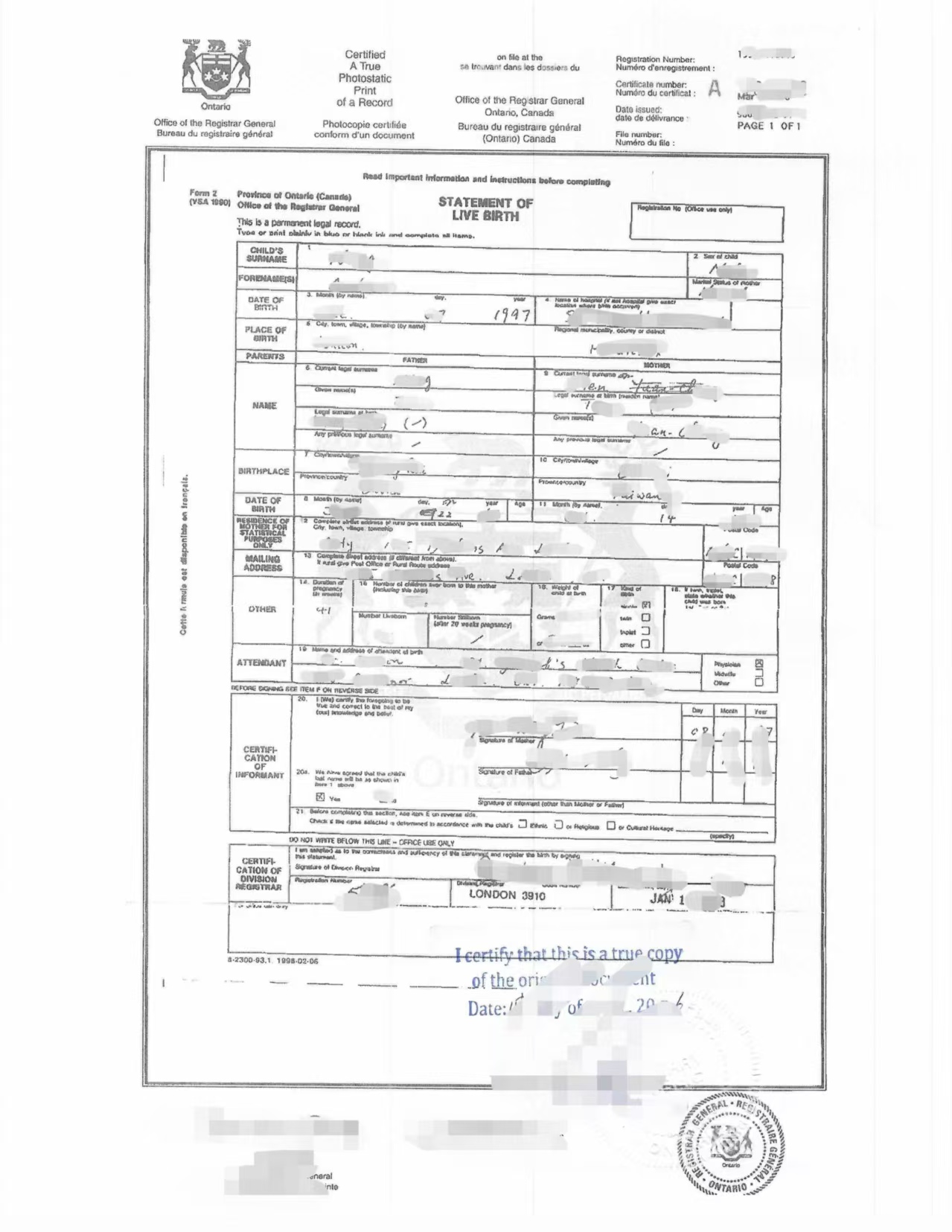 近日,我们完成了一份加拿大1998年版本出生证明(Statement of Live Birth)海牙认证案例。该文件由安大略省注册总署(Office of the Registrar General, Ontario)签发,属于早期纸质版出生记录,表格内容较为复杂,既包含手写信息,也包含出生登记信息,通常在中国办理相关手续时需要进行翻译、公证及海牙认证后方可使用。