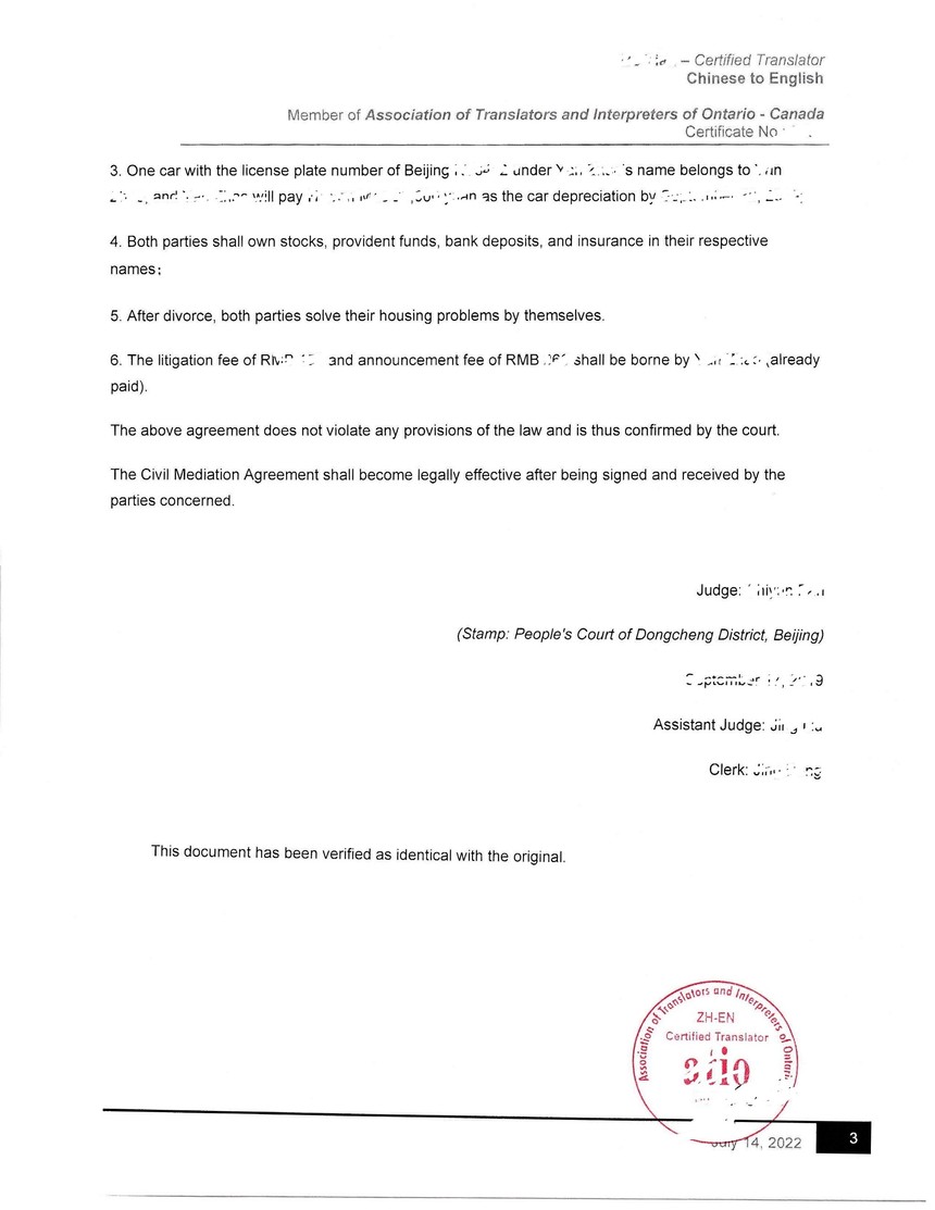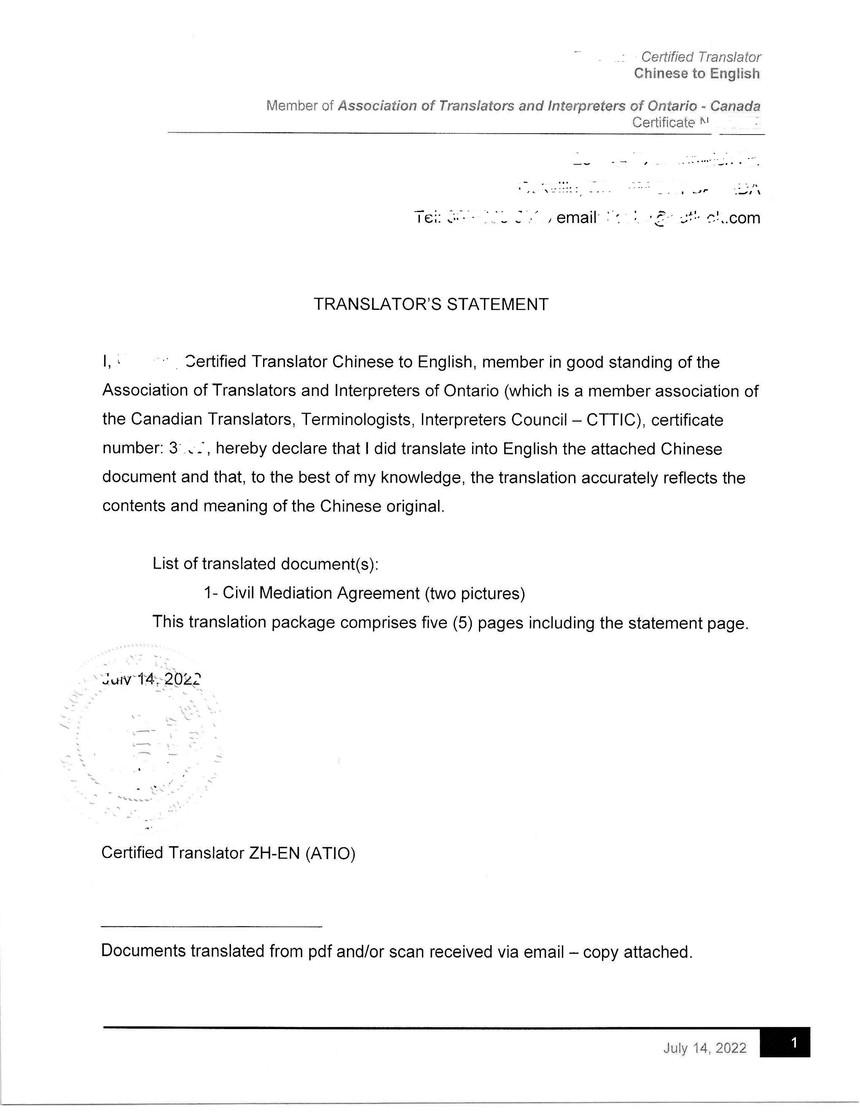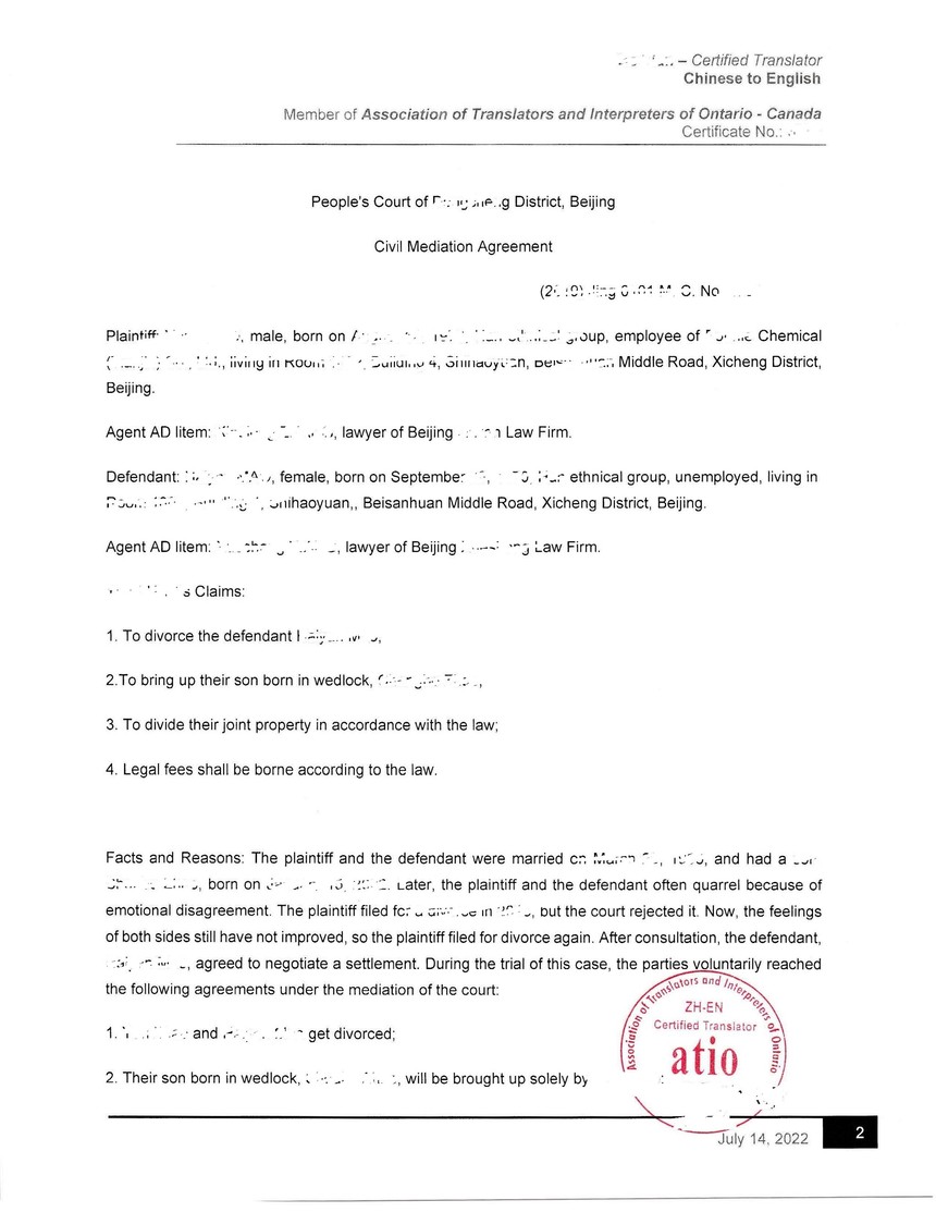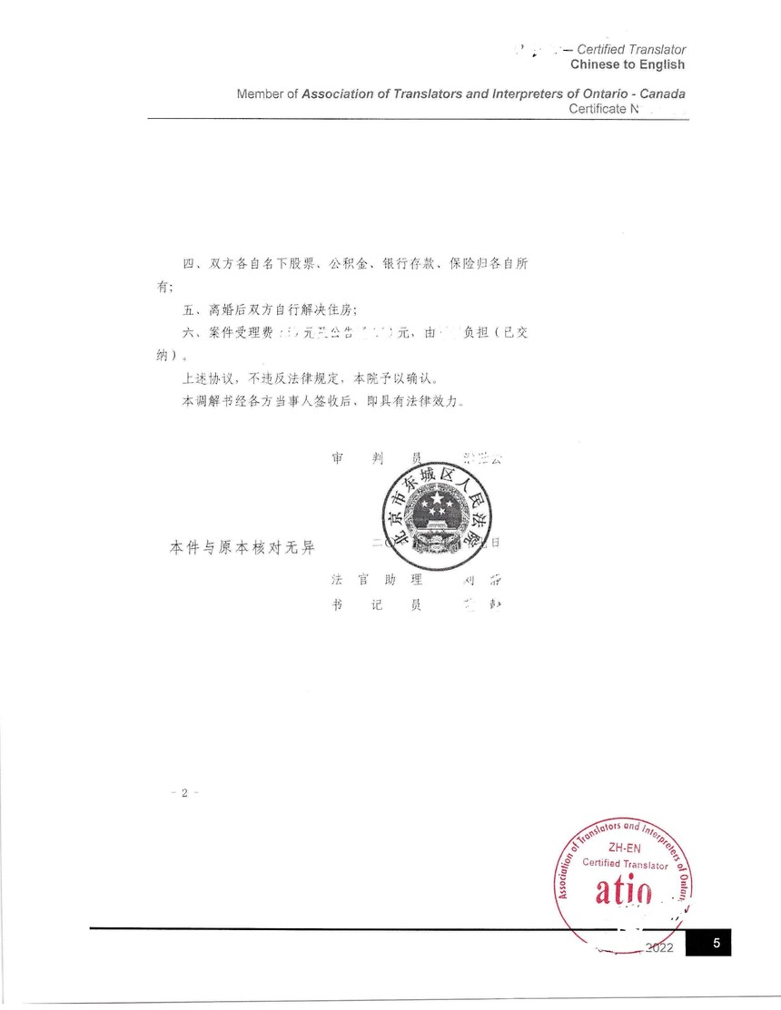 中国法院调解书ATIO认证翻译样品 用于加拿大办理结婚手续 2026/03/16 分类:ATIO认证翻译样稿 6 中国法院调解书ATIO认证翻译样品 用于加拿大办理结婚手续 样本 上一篇: 加拿大ATIO认证翻译样稿:结婚证 出生证 收入证明