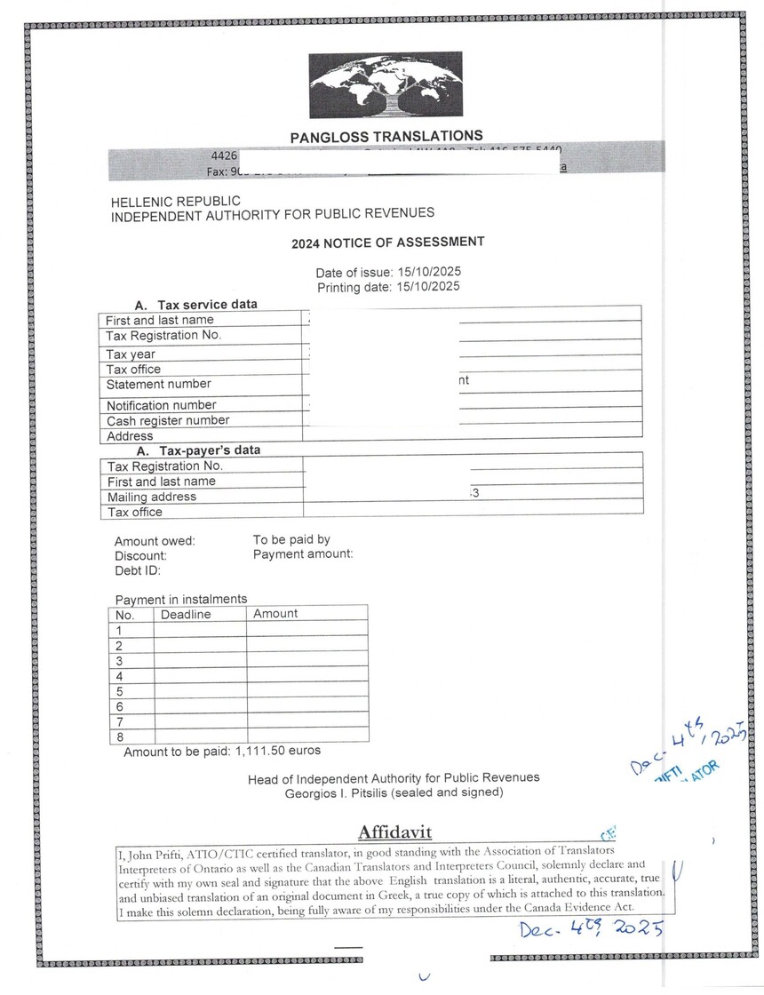 希腊语 → 英语 ATIO 认证翻译,用于加拿大税务局 CRA 报税。