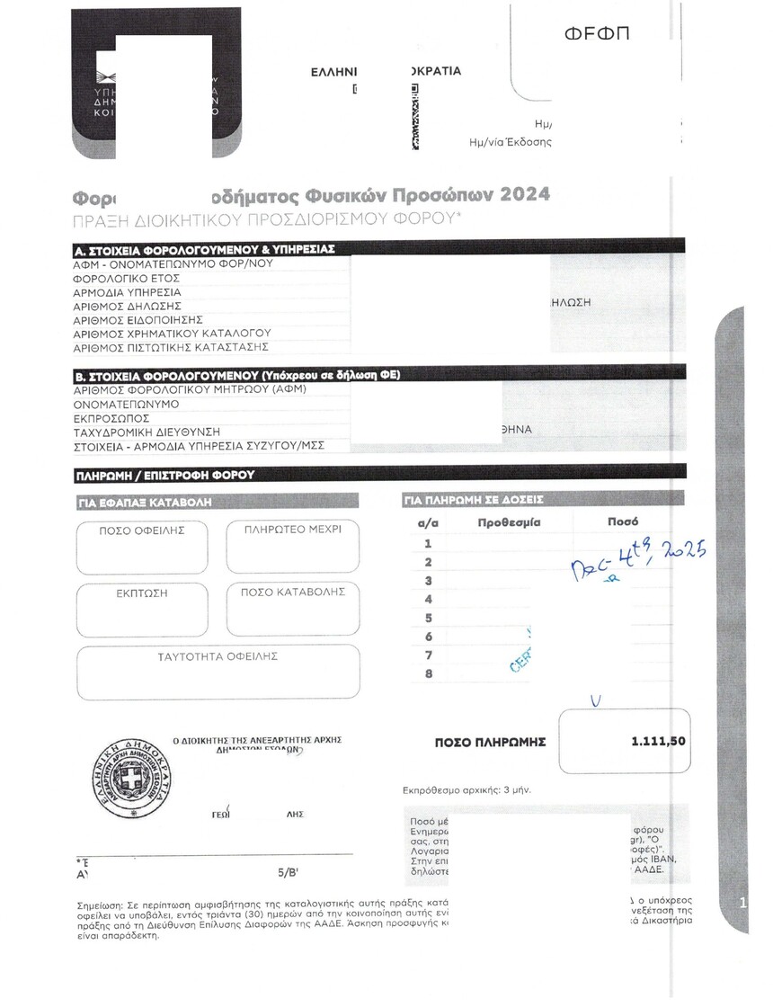 他的希腊税务文件属于年度完税评估声明,内容包括: