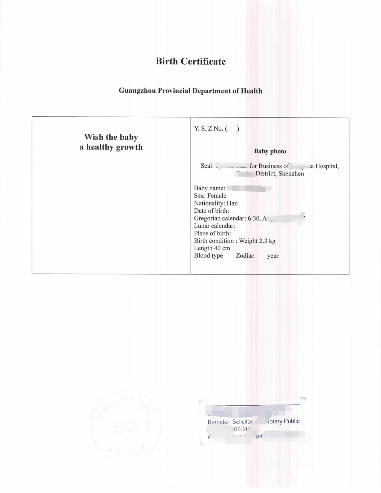 出生医院为深圳龙华医院(带业务专用章)