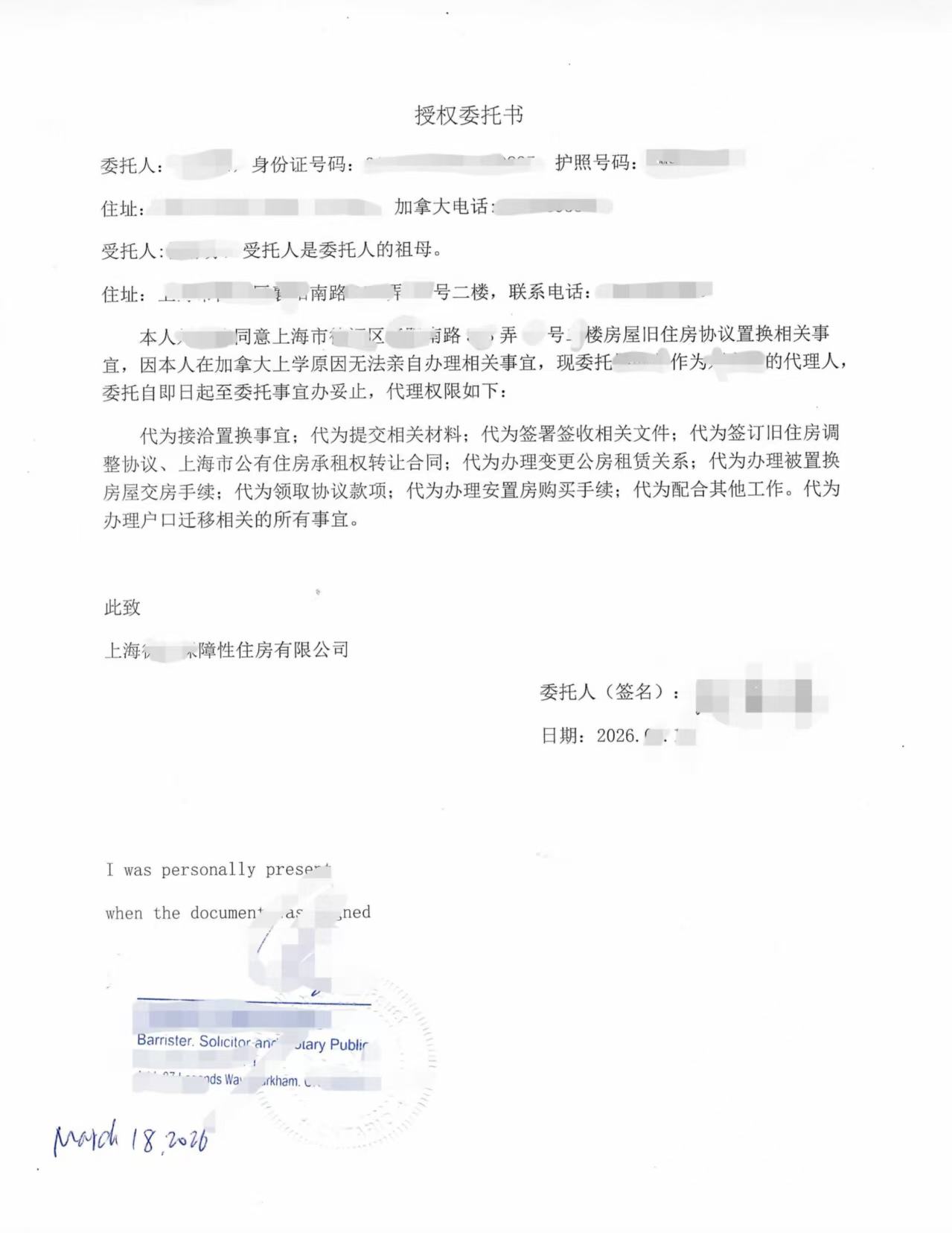 本次办理的是一份用于上海徐汇区公有住房置换调整协议签署的授权委托书,当事人长期居住在加拿大,无法回国亲自办理相关手续,因此委托国内亲属代为处理。