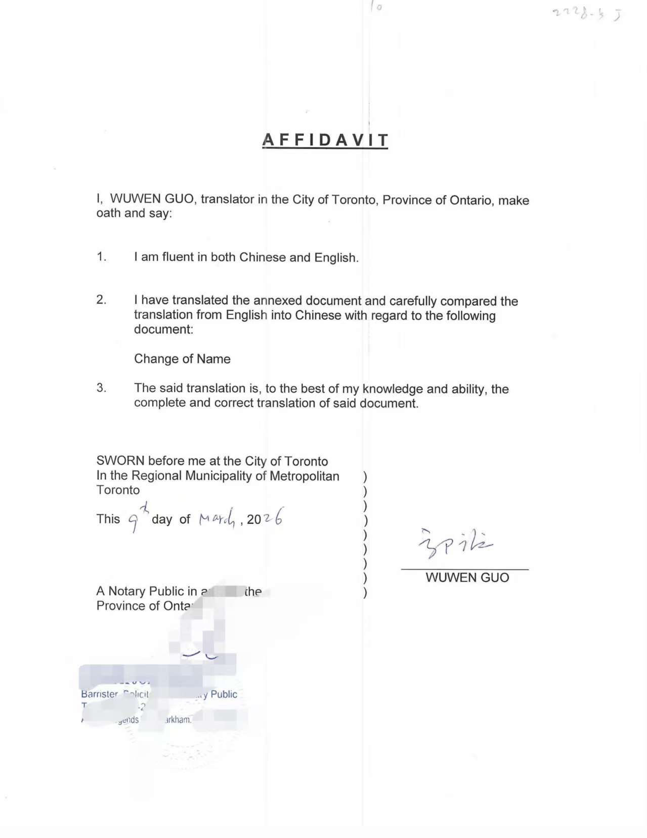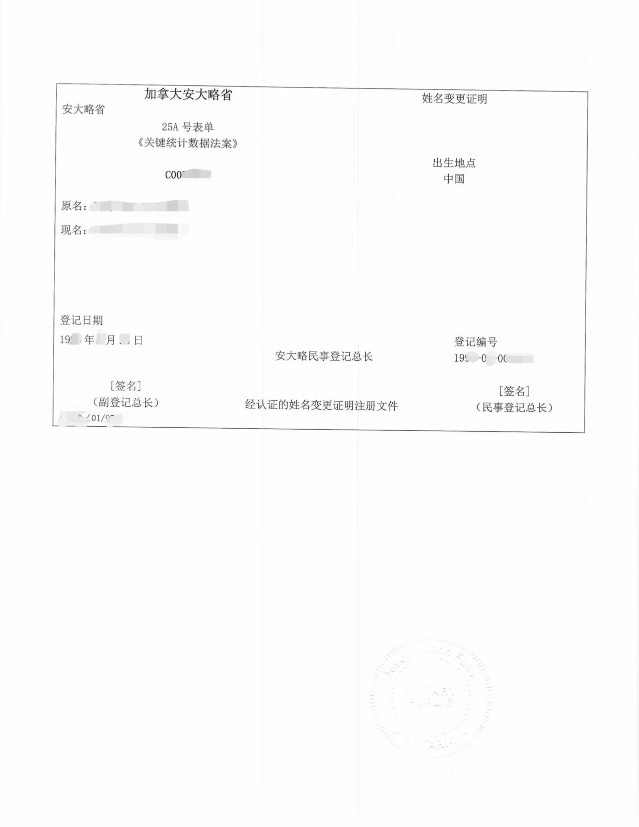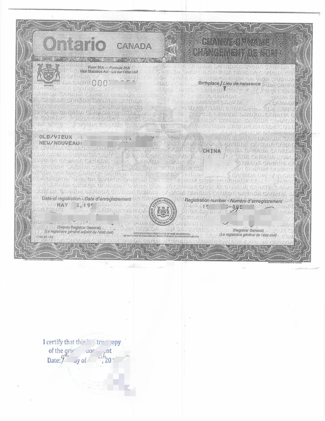 本案例涉及一份由加拿大安大略省政府签发的姓名变更证明文件(Change of Name Certificate),用于在中国办理身份衔接、房产、继承等事务。