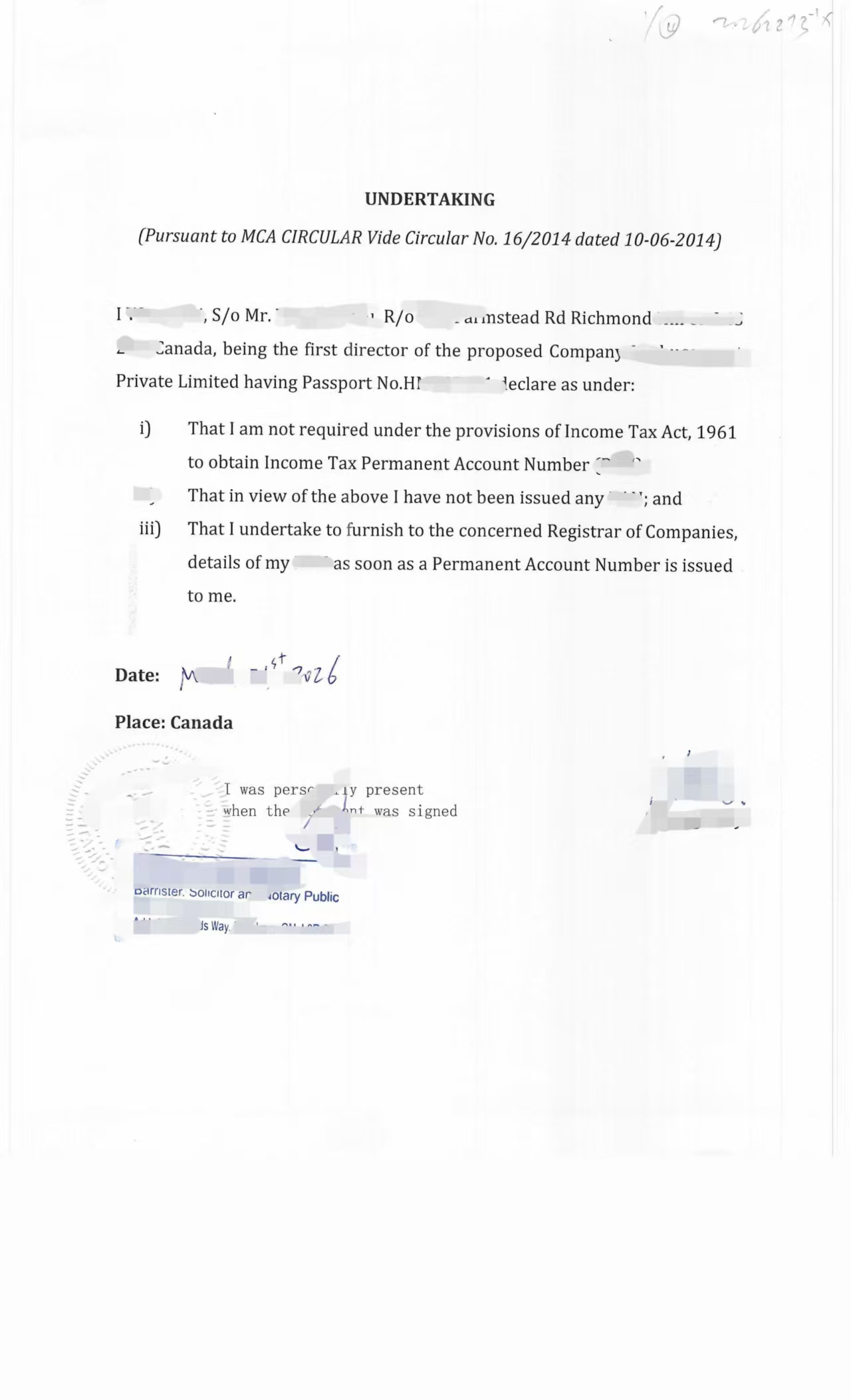 本案例为一位在加拿大定居的华人客户(化名王先生),拟作为股东及董事,在印度设立私人有限公司。根据印度公司注册要求,外籍董事需出具一份承诺书(Undertaking),主要涉及是否需要申请印度税号(PAN)及后续补充义务。