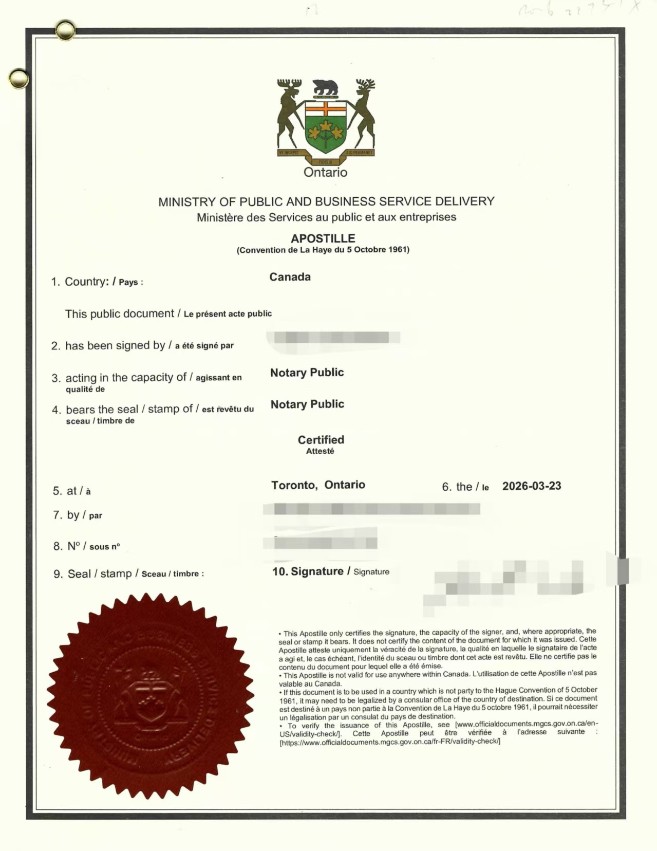 客户在加拿大签署承诺书后,由当地律师进行见证签字,并出具公证意见:“I was personally present when the document was signed.” 随后文件递交安省政府办理海牙认证(Apostille)。