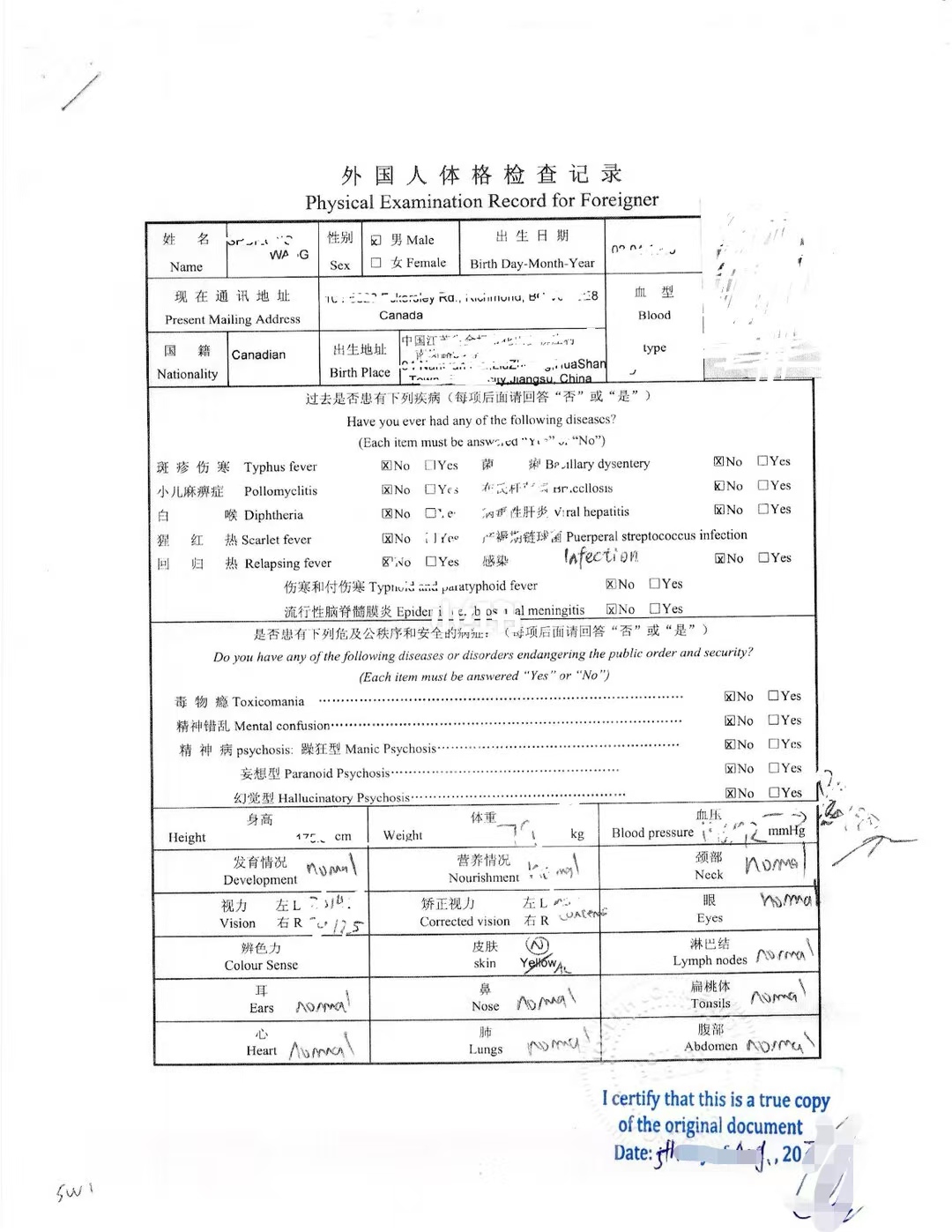加拿大外国人体检报告海牙认证回国用途