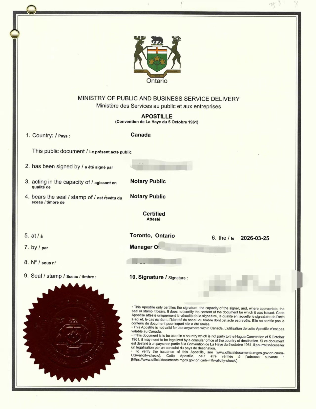 将律师公证书提交至加拿大全球事务部(Global Affairs Canada),申请附加证明书(Apostille),即海牙认证页 。