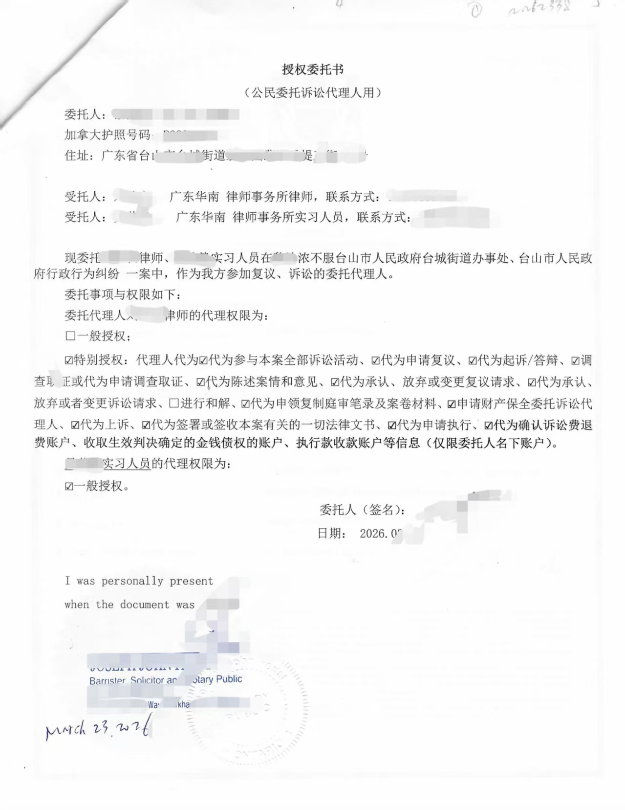 客户L先生(化名),现为加拿大籍华人,因在中国广东台山涉及一起行政纠纷,需要向当地法院提起行政复议及行政诉讼。但由于本人长期居住在加拿大,无法亲自回国办理相关手续,因此委托国内律师全权代理处理案件,包括复议申请、行政诉讼、证据调取及庭审参与等事项。