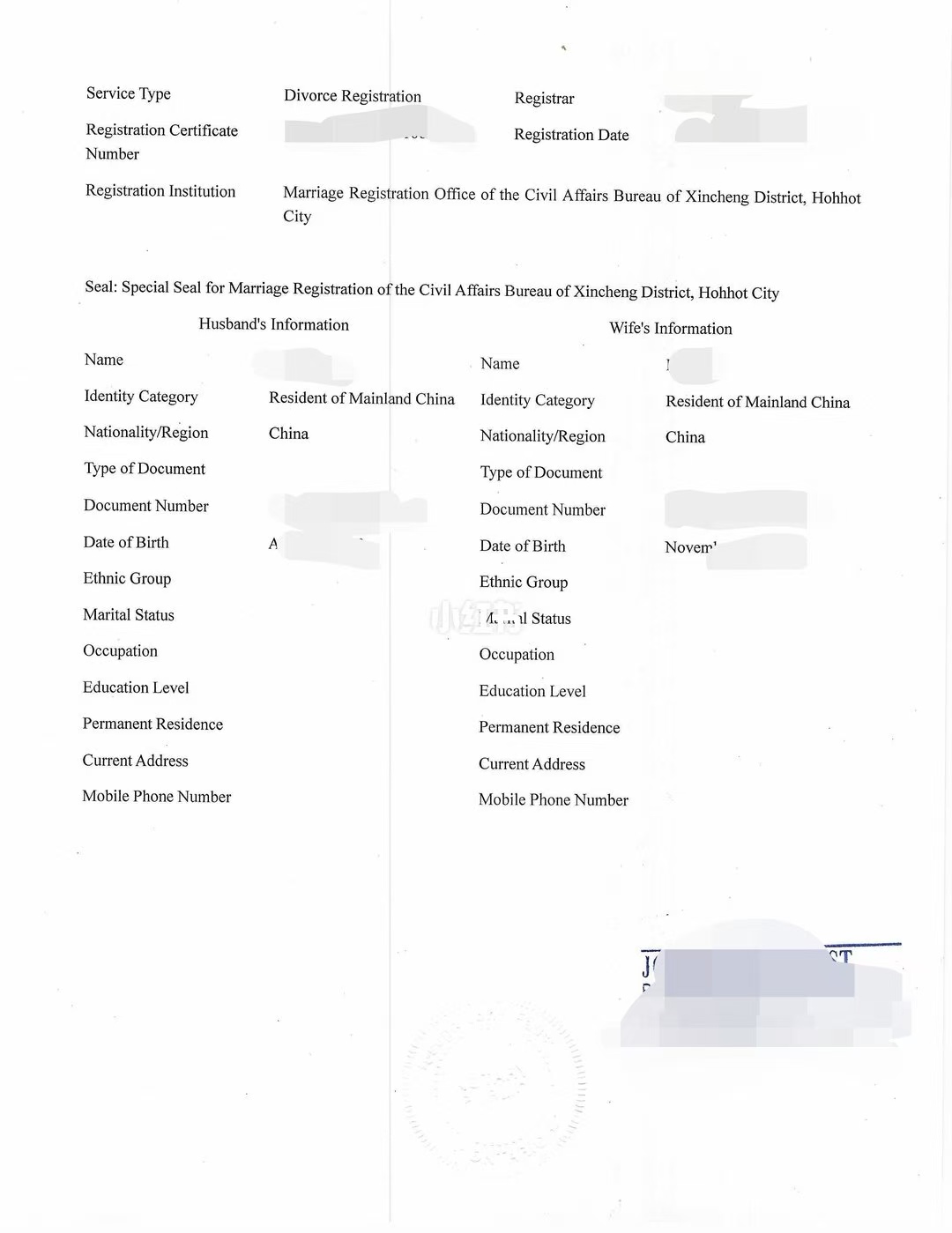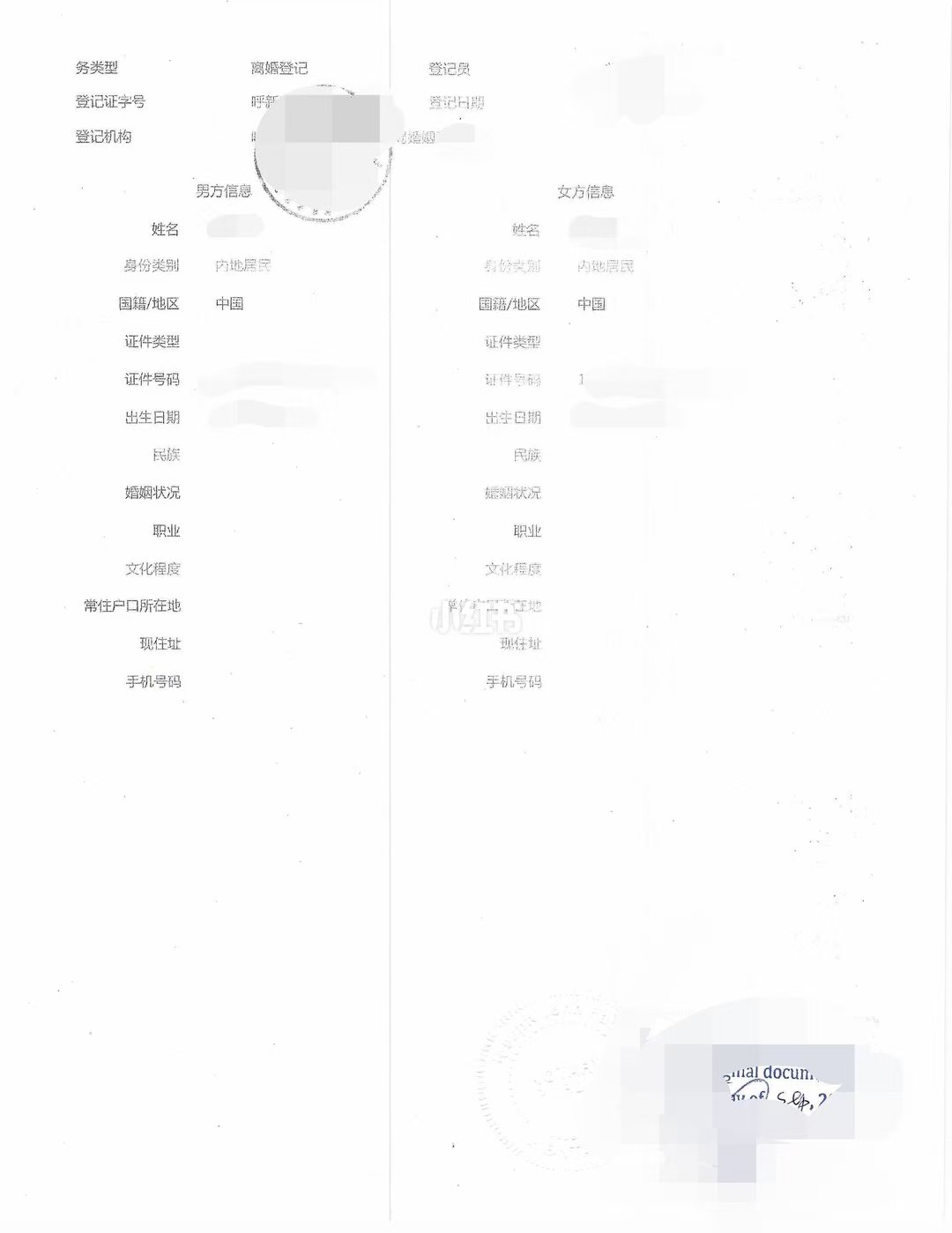 中国离婚证明在加拿大翻译公证用于移民申请