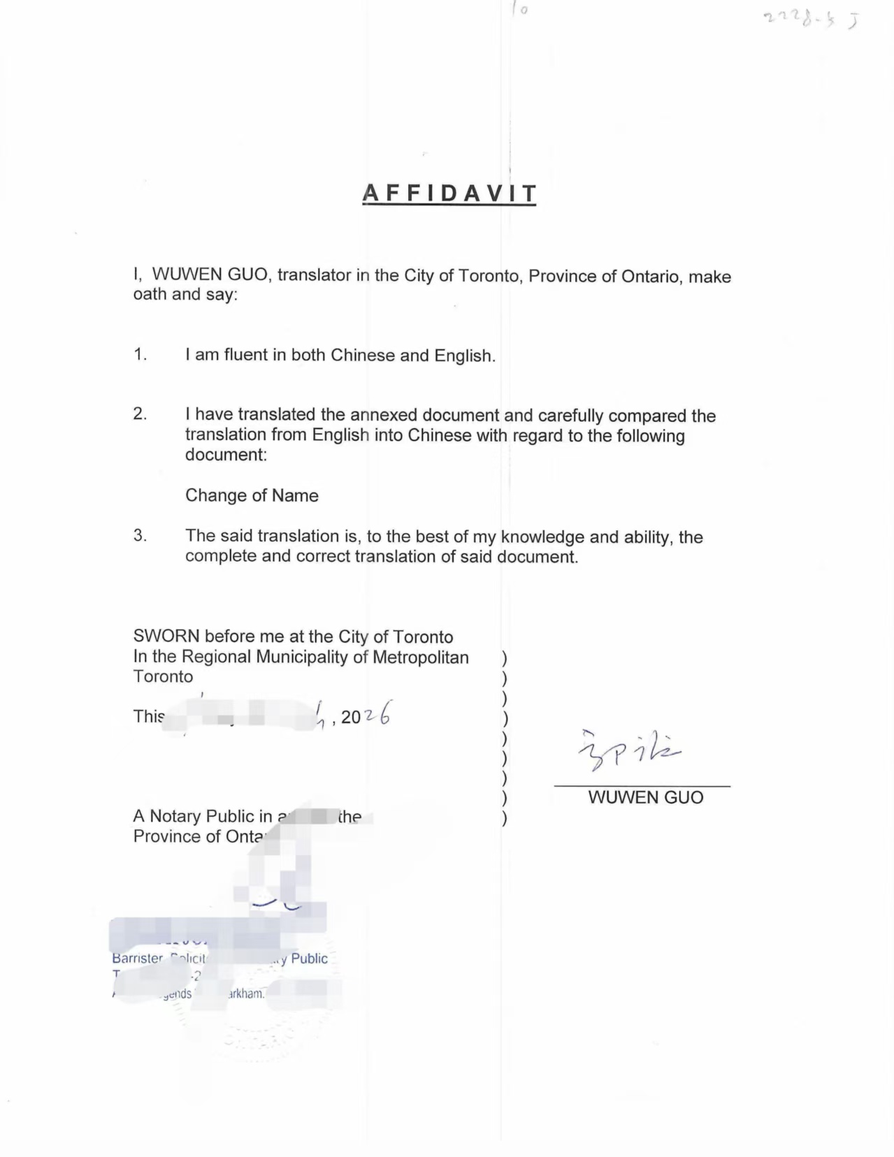翻译完成后,办理宣誓公证(Affidavit)——译员在公证员或监誓官面前宣誓翻译准确性并盖章。