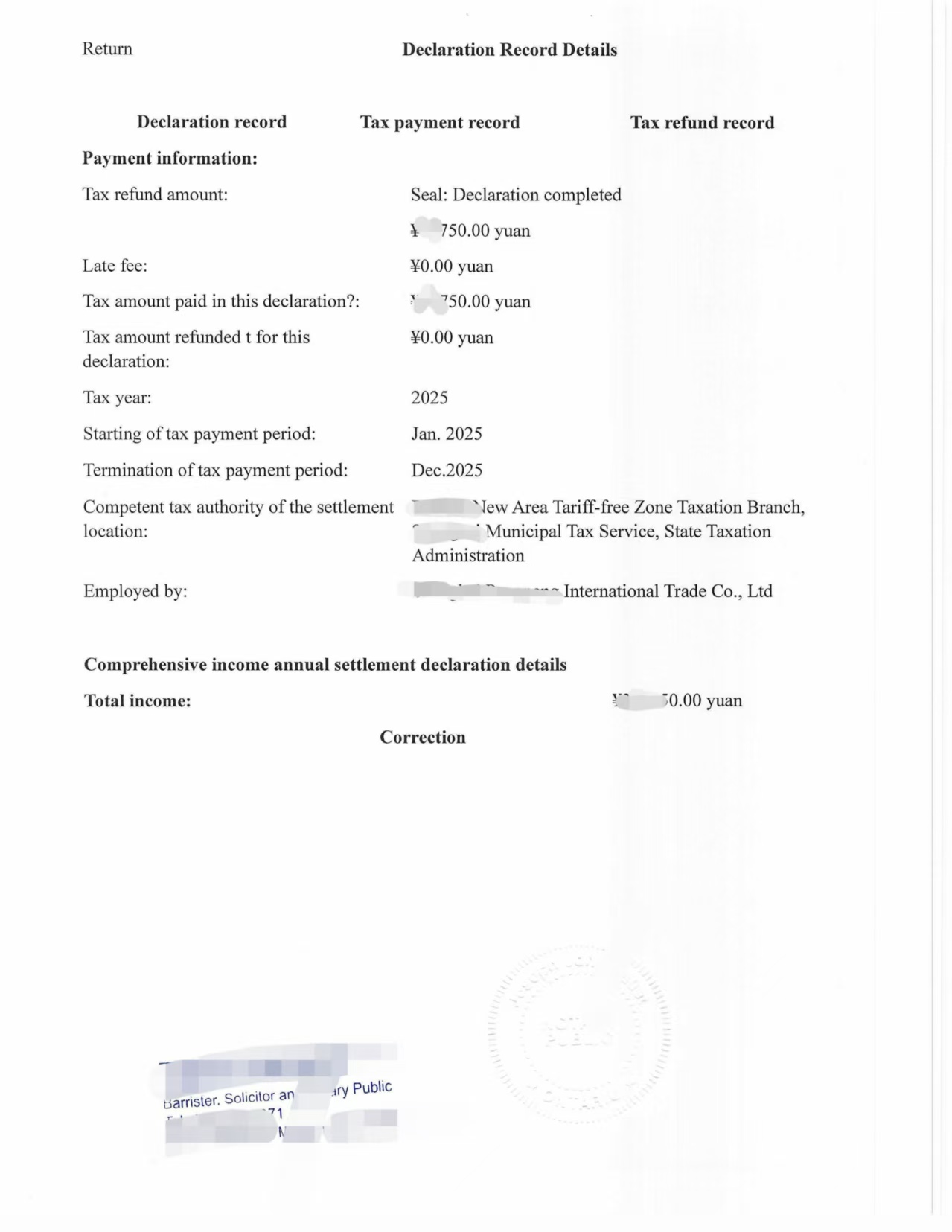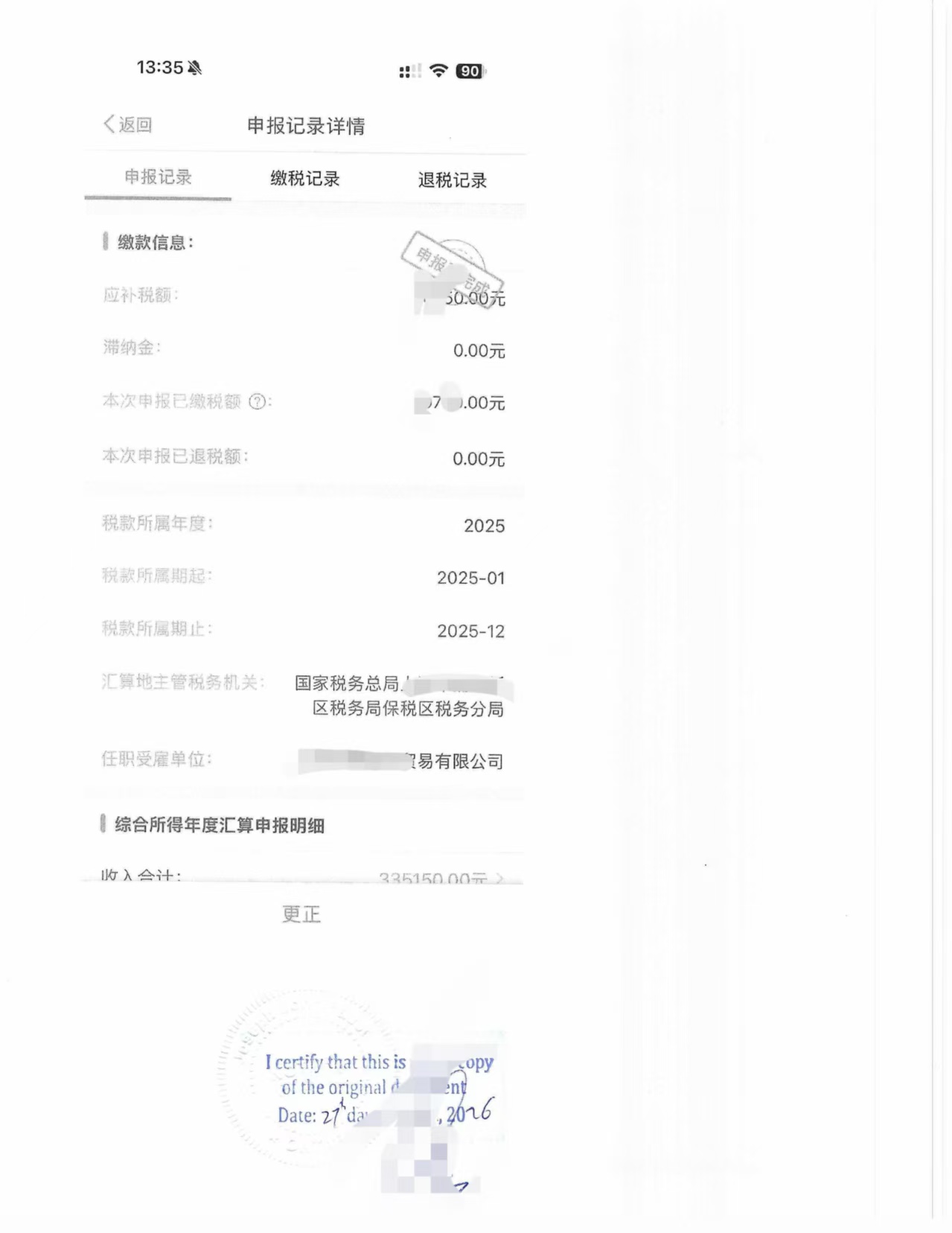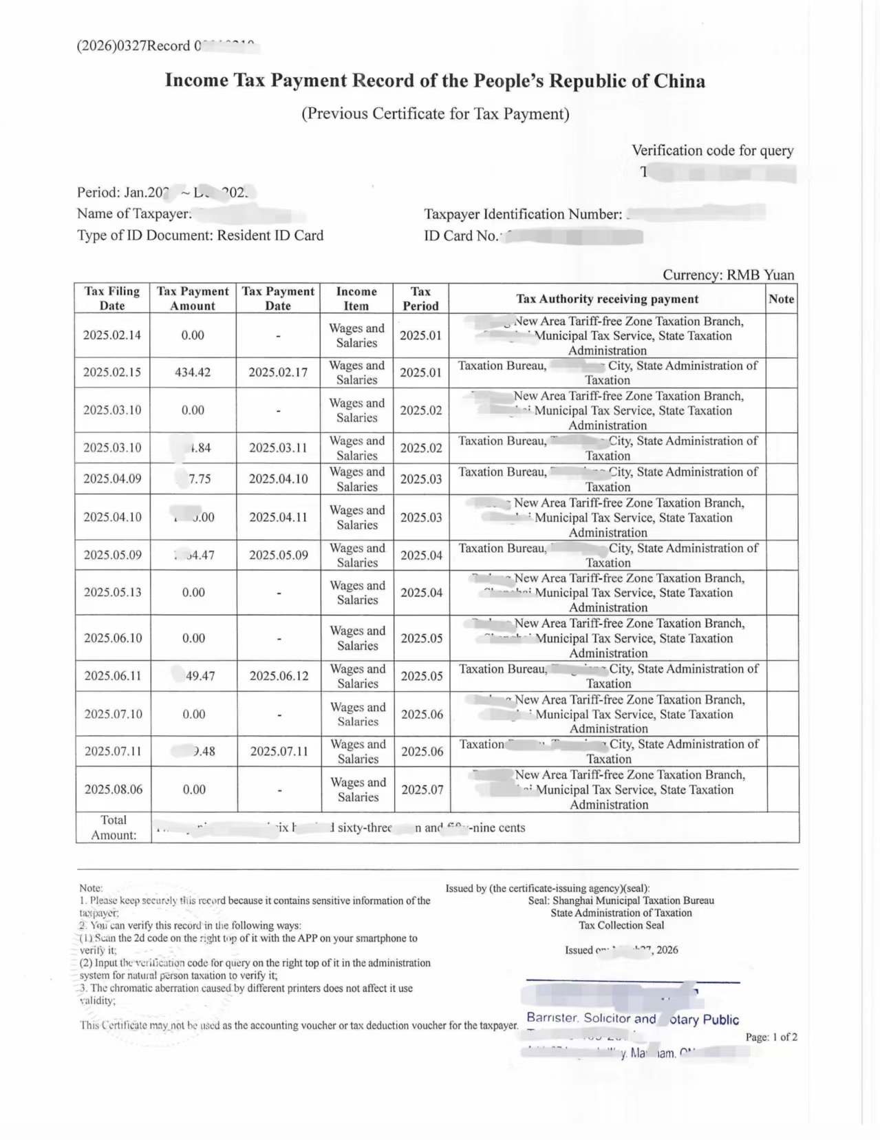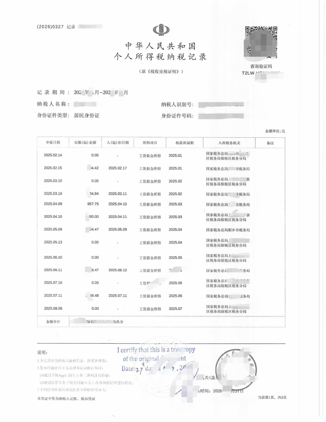 最近正值加拿大报税季,不少客户需要提交中国收入和纳税情况作为补充材料。这次刚刚完成一单中国个人所得税纳税记录 + 申报记录详情的翻译公证,分享给大家参考。