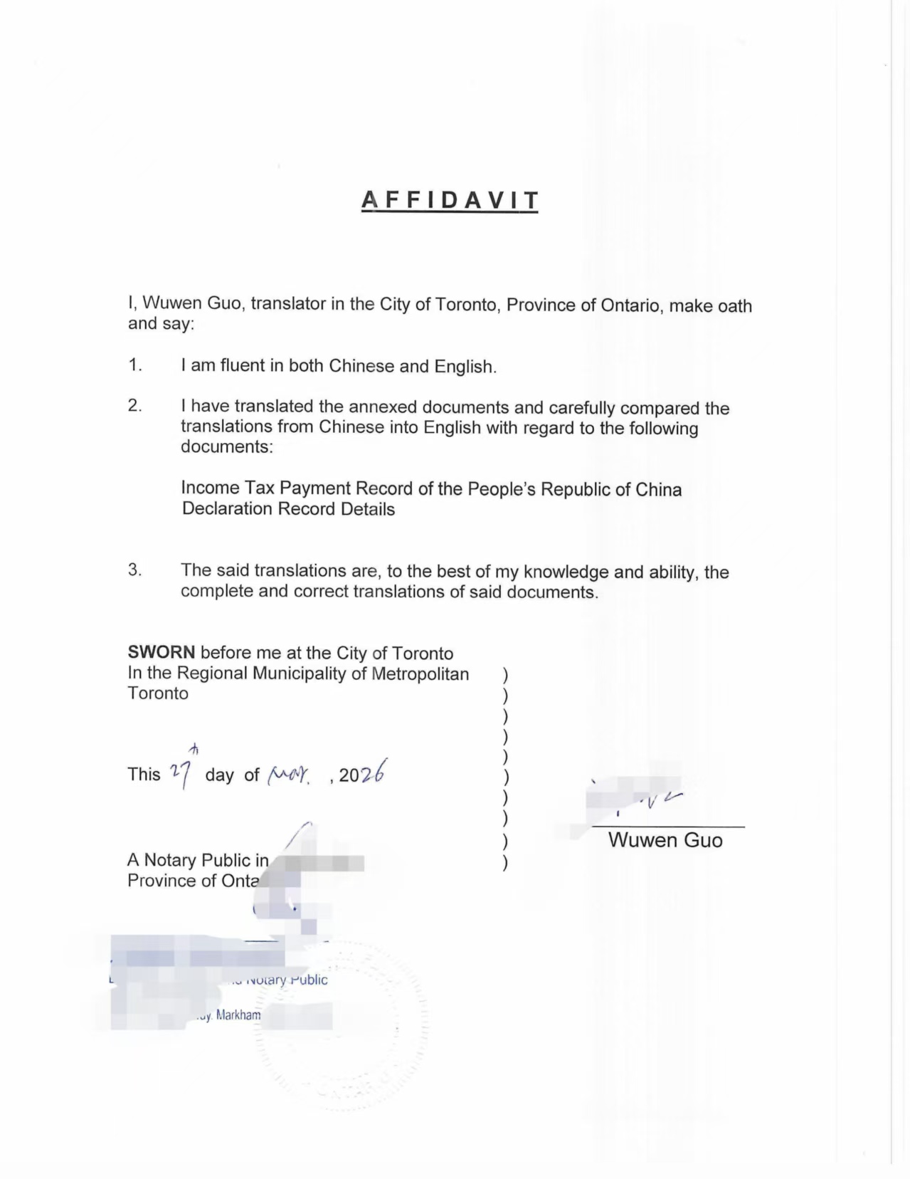 翻译宣誓书(Affidavit)