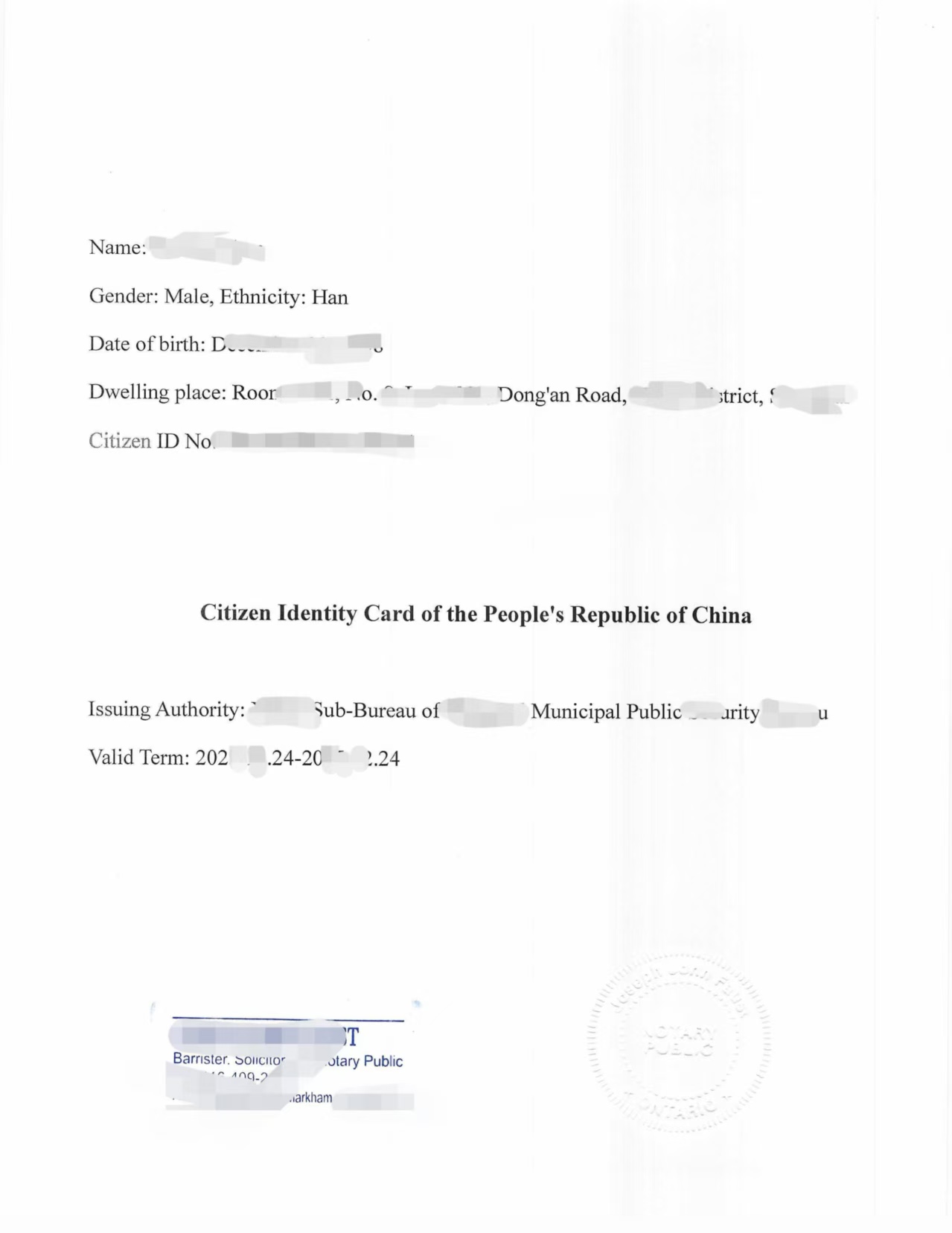 中国身份证翻译公证案例移民加拿大最常用