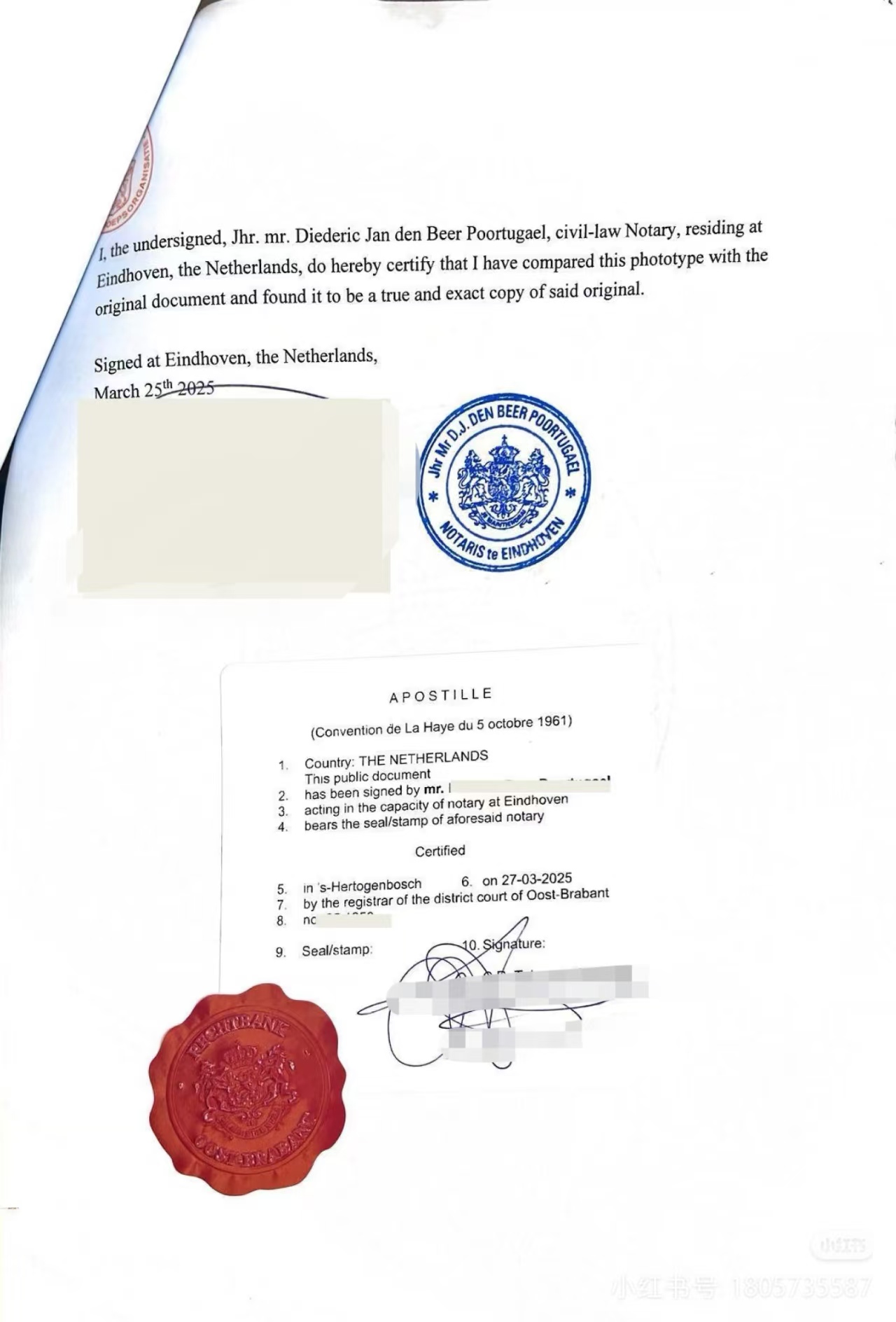 *首先将荷兰学历证原件及护照复印件,交由当地公证员(Notaris)公证,核实文件一致性并加盖公证章。
