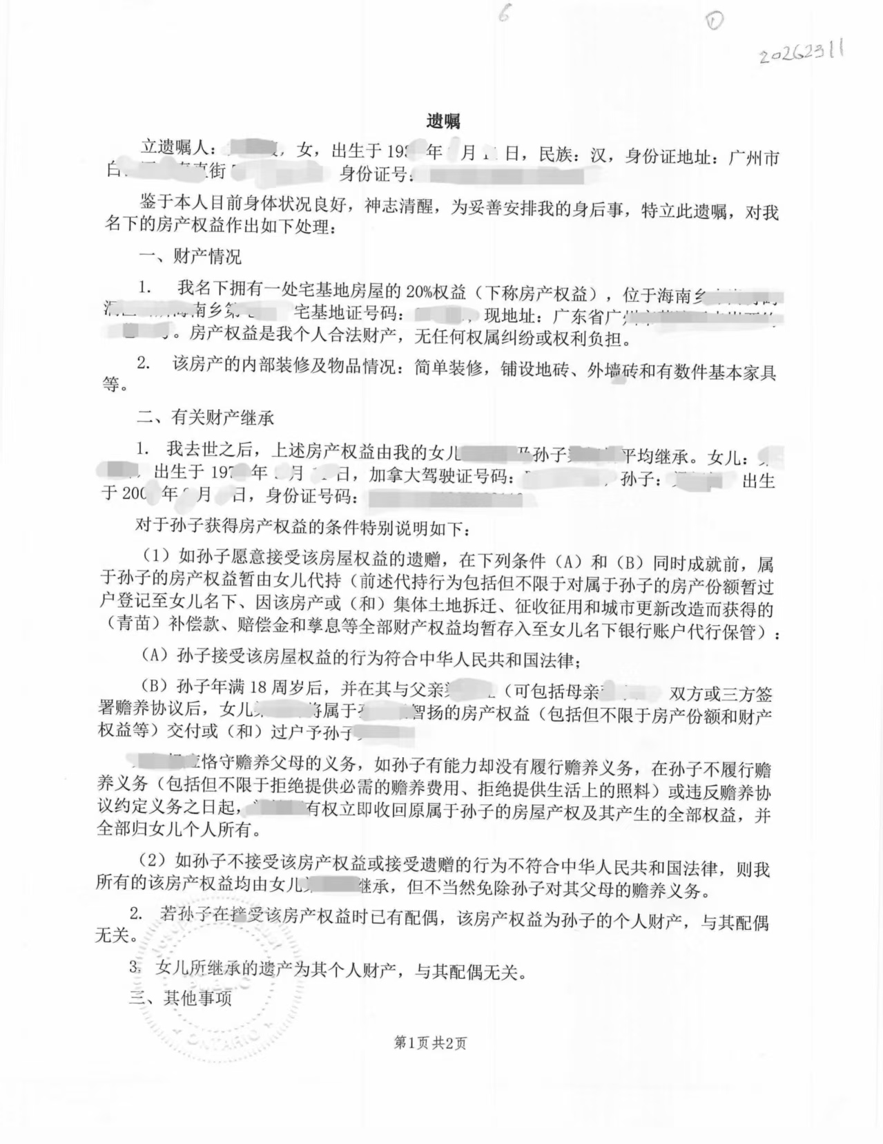 客户在加拿大,想把海南一处宅基地房屋的部分权益留给孙子,但人不方便回国办理,于是选择在加拿大直接订立遗嘱,并办理海牙认证后寄回国内使用。
