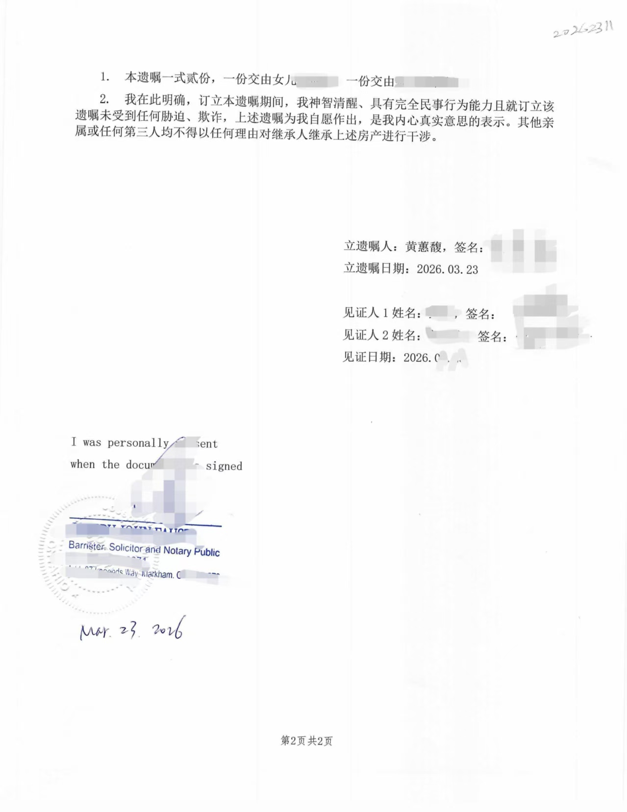 一、在加拿大完成遗嘱签署