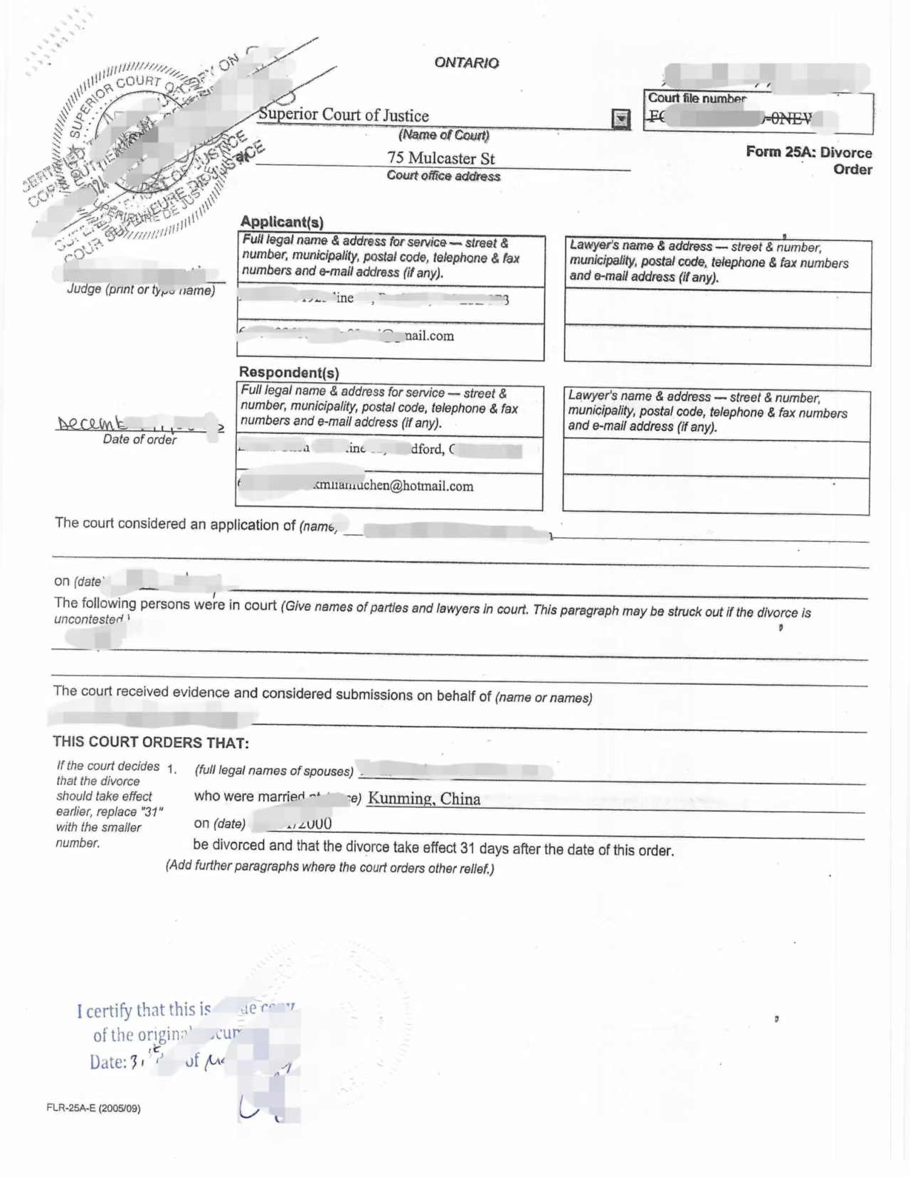 由安省持牌律师对离婚判决书进行“与原件一致”公证